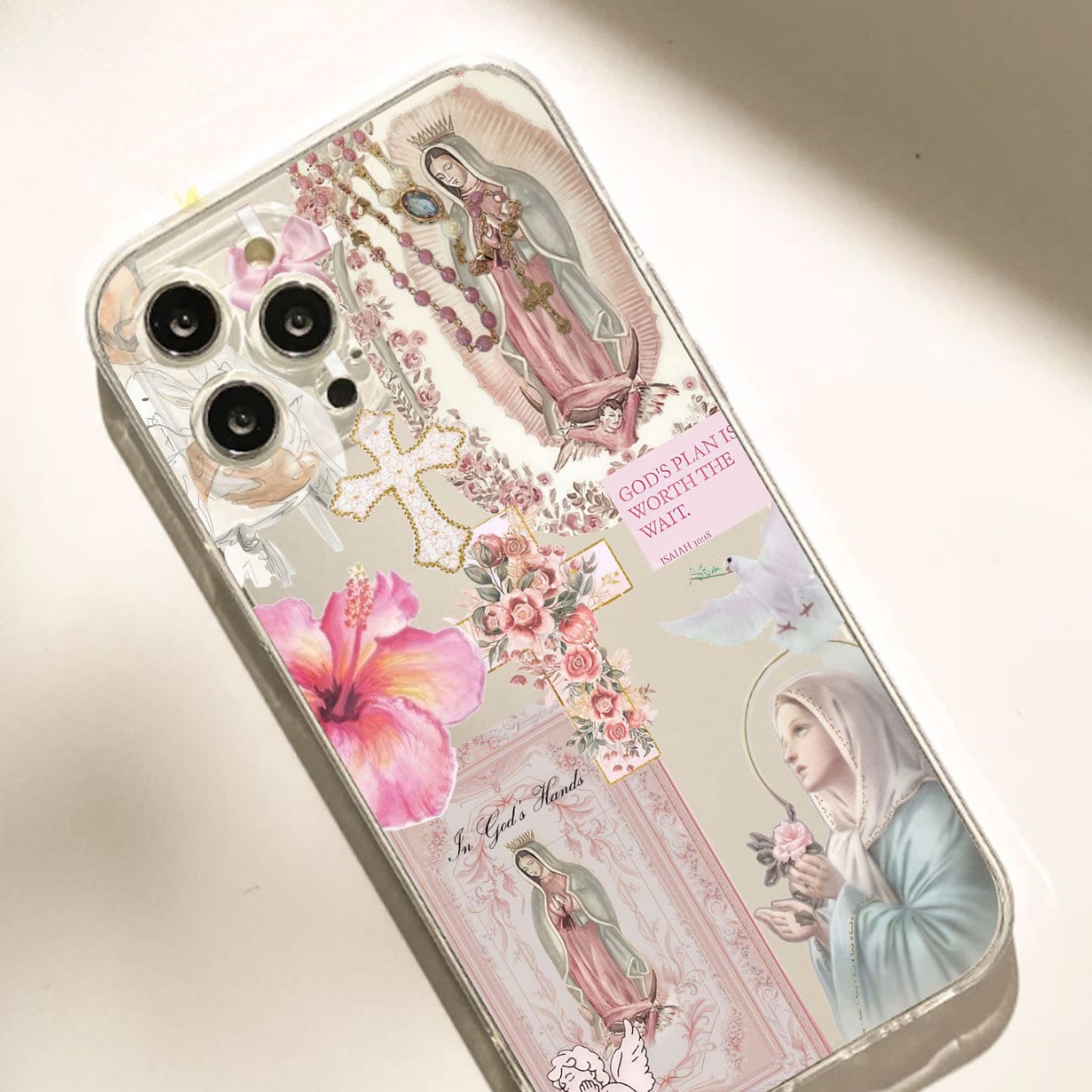 This phone case weaves sacred imagery (Our Lady motifs, crosses, and the “In God’s Hands” phrase) with soft florals — a gentle emblem of divine presence and devotion. -