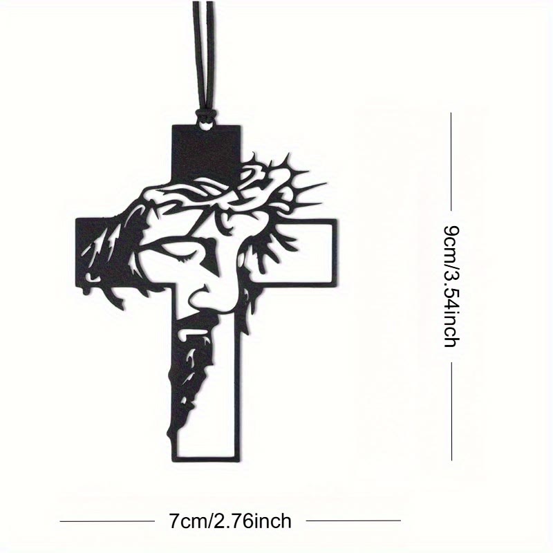 This car ornament features a striking cross integrated with the image of Jesus wearing the crown of thorns, crafted in a bold black silhouette design. Its intricate detailing merges faith and artistry seamlessly. -