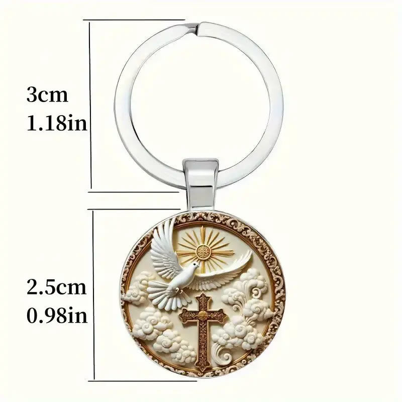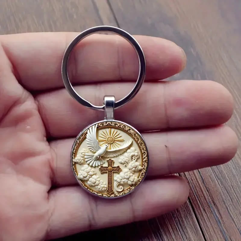 This keychain showcases a cross and a dove, symbols of salvation and the Holy Spirit. It serves as a daily reminder of God's love and spiritual tranquility. -