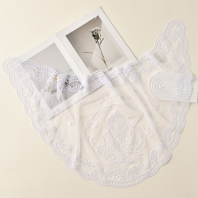 The veil features an intricate image of the Virgin Mary with the Child Jesus, symbolizing motherly care, divine love, and spiritual shelter. Embroidered with the word “Jerusalem”, it recalls the holy city, the foundation of Christian faith and pilgrimage.