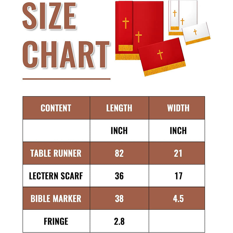 Designed to include a table runner, lectern scarf, and Bible marker, this set ensures every focal point of worship is adorned with sacred reverence.