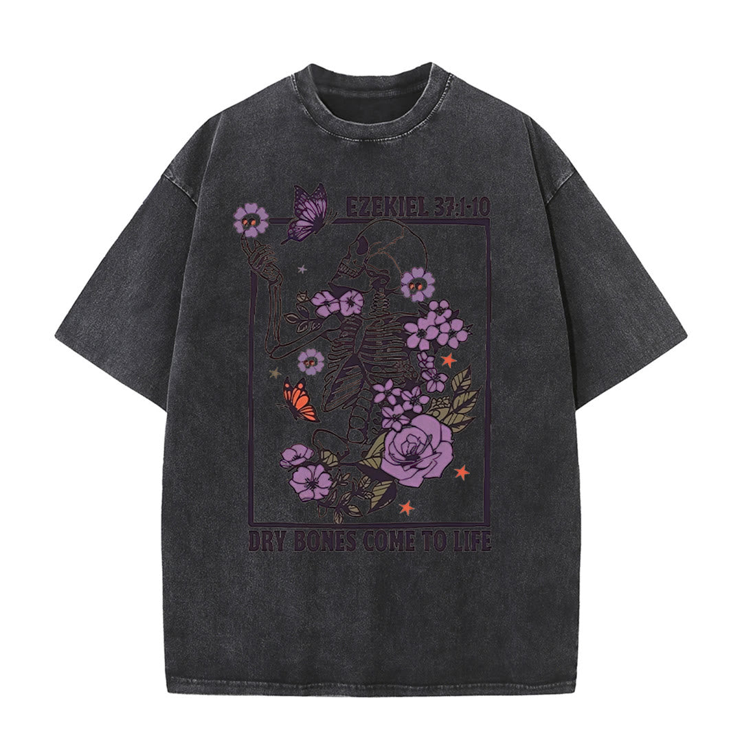 On the front of this T-shirt, a vivid graphic of Ezekiel 37:1 - 10 with a skeleton surrounded by flowers and butterflies, plus “DRY BONES COME TO LIFE”, is presented. Wearing it is not only a display of faith - inspired artistry but also a reminder to ourselves of God’s power to bring new life, keeping this profound biblical message in mind in our daily lives.