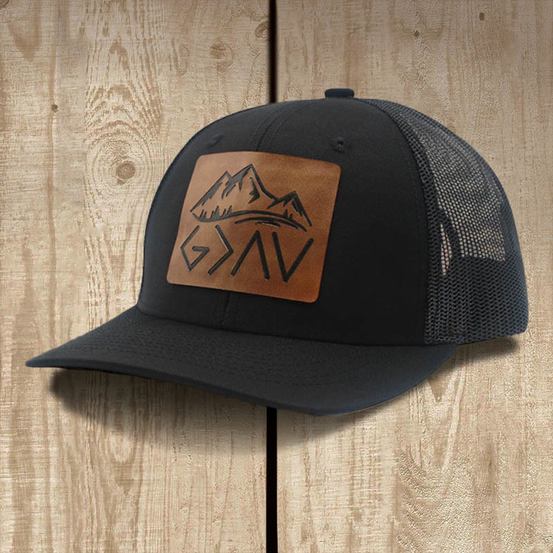 This cap carries the iconic “G>ΛV” symbol, a simple yet profound reminder that God is greater than the highs and lows of life. The mountain illustration represents the peaks and valleys of our journey. -
