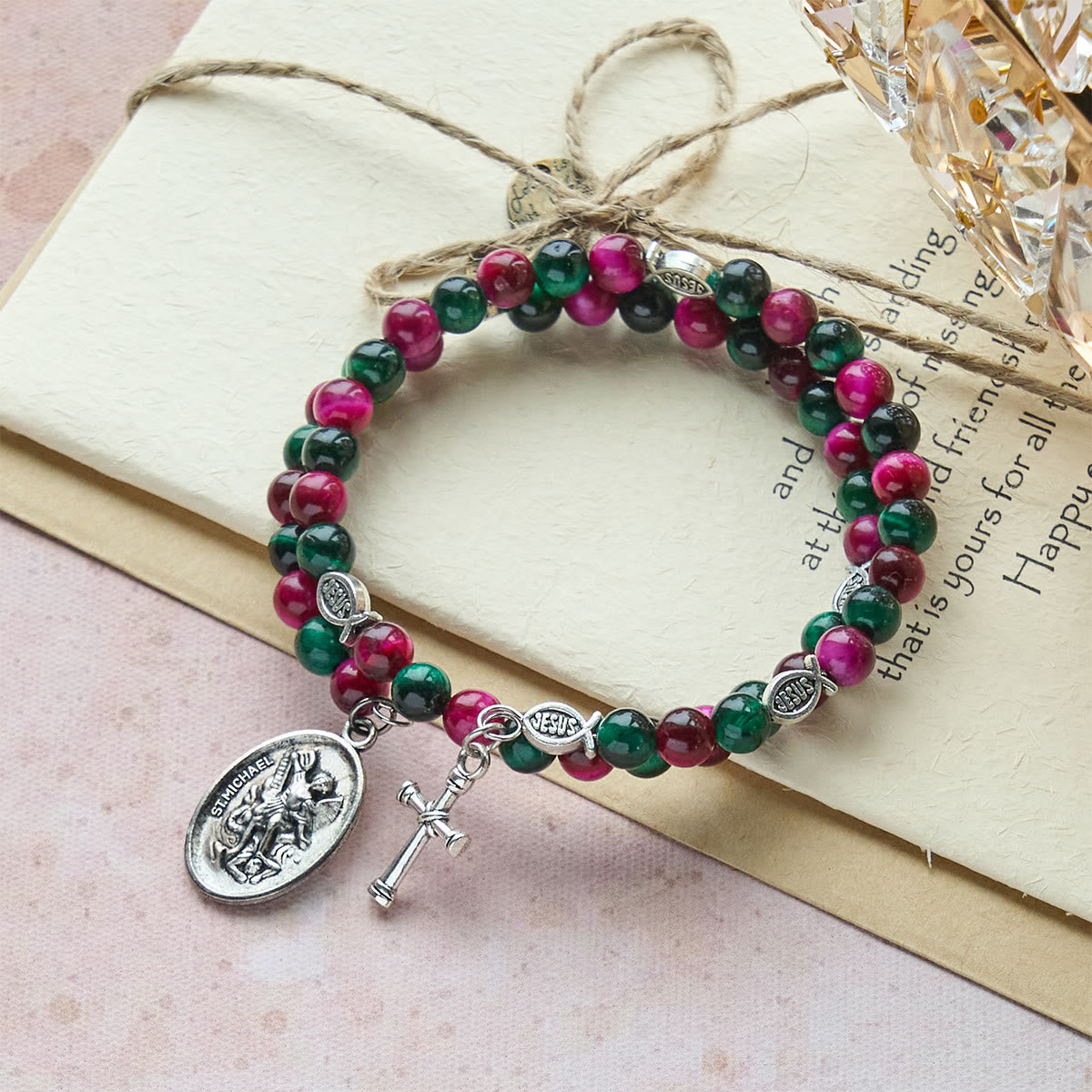 Every wrap of the memory-wire coil embraces the wrist with steadfast devotion. Tiger eye’s bold sheen speaks of steadiness in trials, while Saint Michael—the heavenly protector—invokes courage against darkness. The crucifix roots the piece in Christ’s sacrifice and victorious love. -