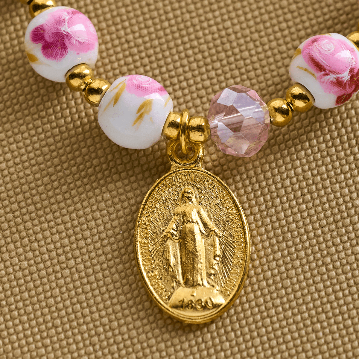 Elegant 8mm Flower Pattern Pink Ceramic Bracelet with Miraculous Medal