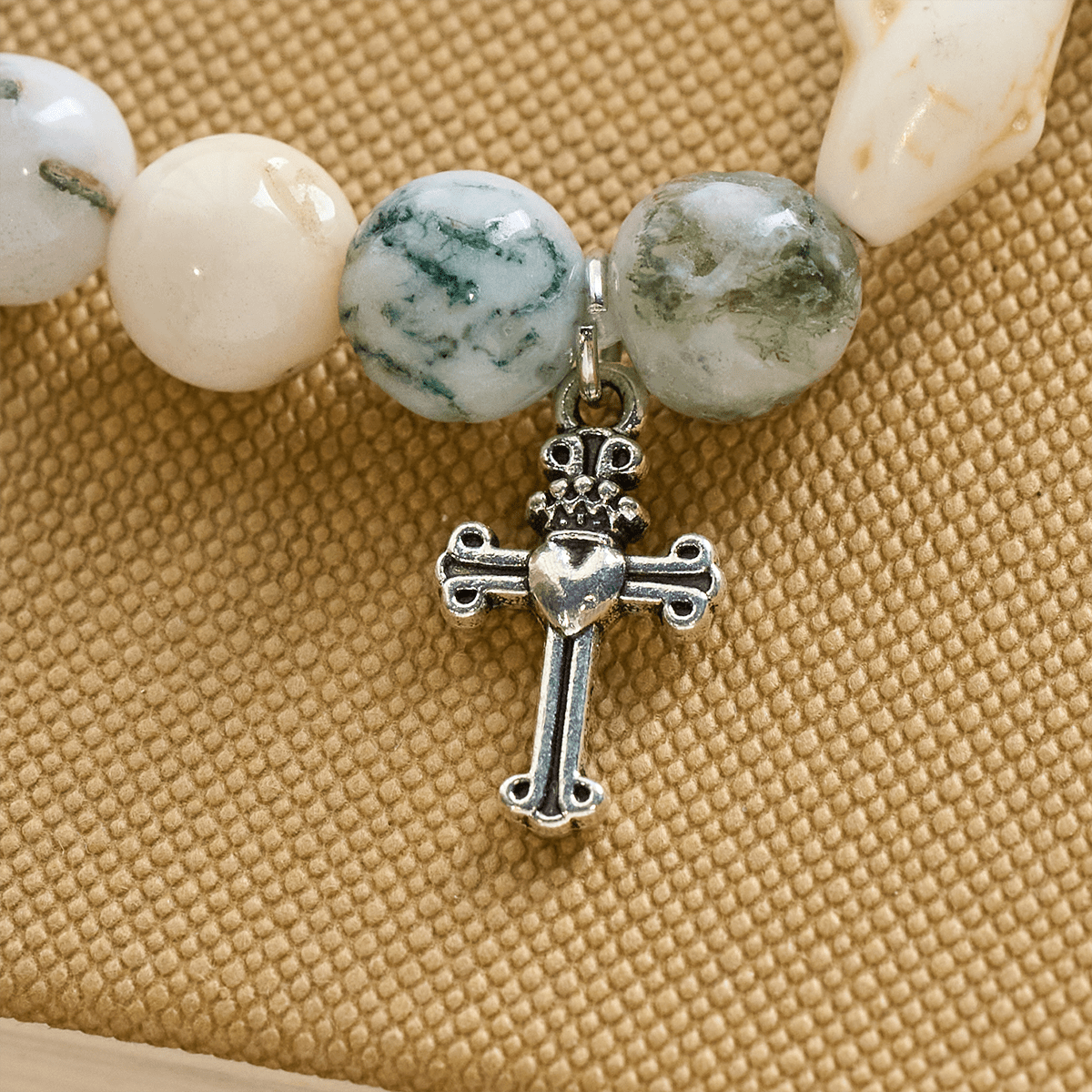 Wear this bracelet daily as a shield of faith, whether in moments of quiet reflection, during prayer, or as a discreet expression of your devotion. Its natural volcanic agate stones not only bring rugged beauty but also invite a grounding sense of peace. -