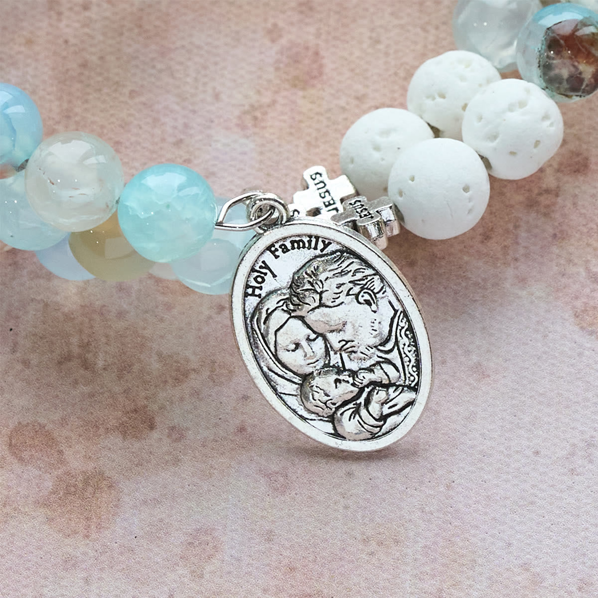 At its core lies the ornate silver crucifix, an eternal emblem of redemption and heavenly mercy. Alongside it, a Holy Family medallion — a declaration of faith in divine love and family unity. Together, they echo the Gospel’s heart: salvation, peace, and the strength to walk in His light daily. -