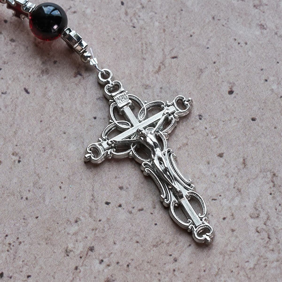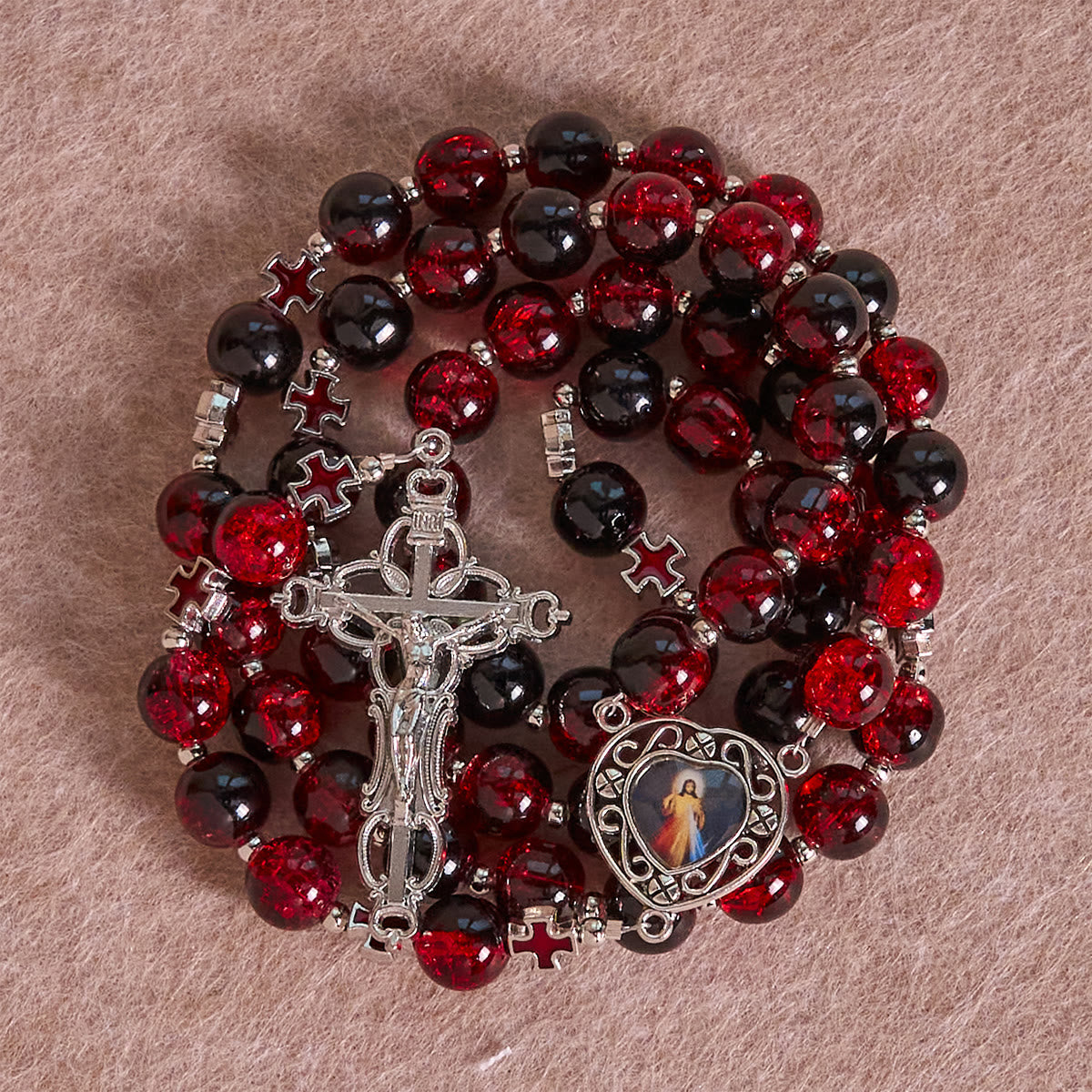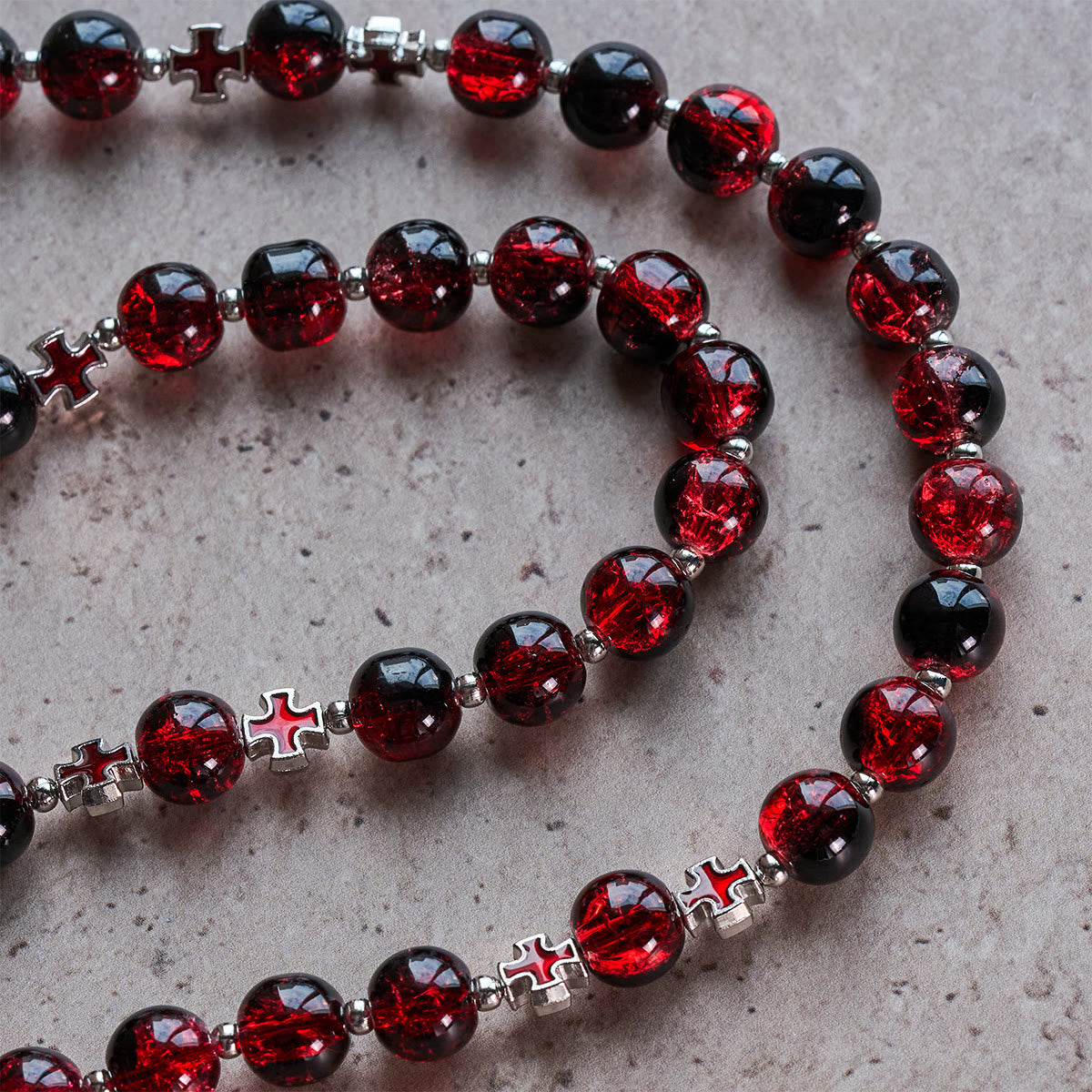 The interplay of red and black creates a profound visual meditation — the contrast of pain and mercy, justice and love. Each bead glimmers like a droplet of devotion, reflecting the mystery of the Passion and the triumph of forgiveness. -