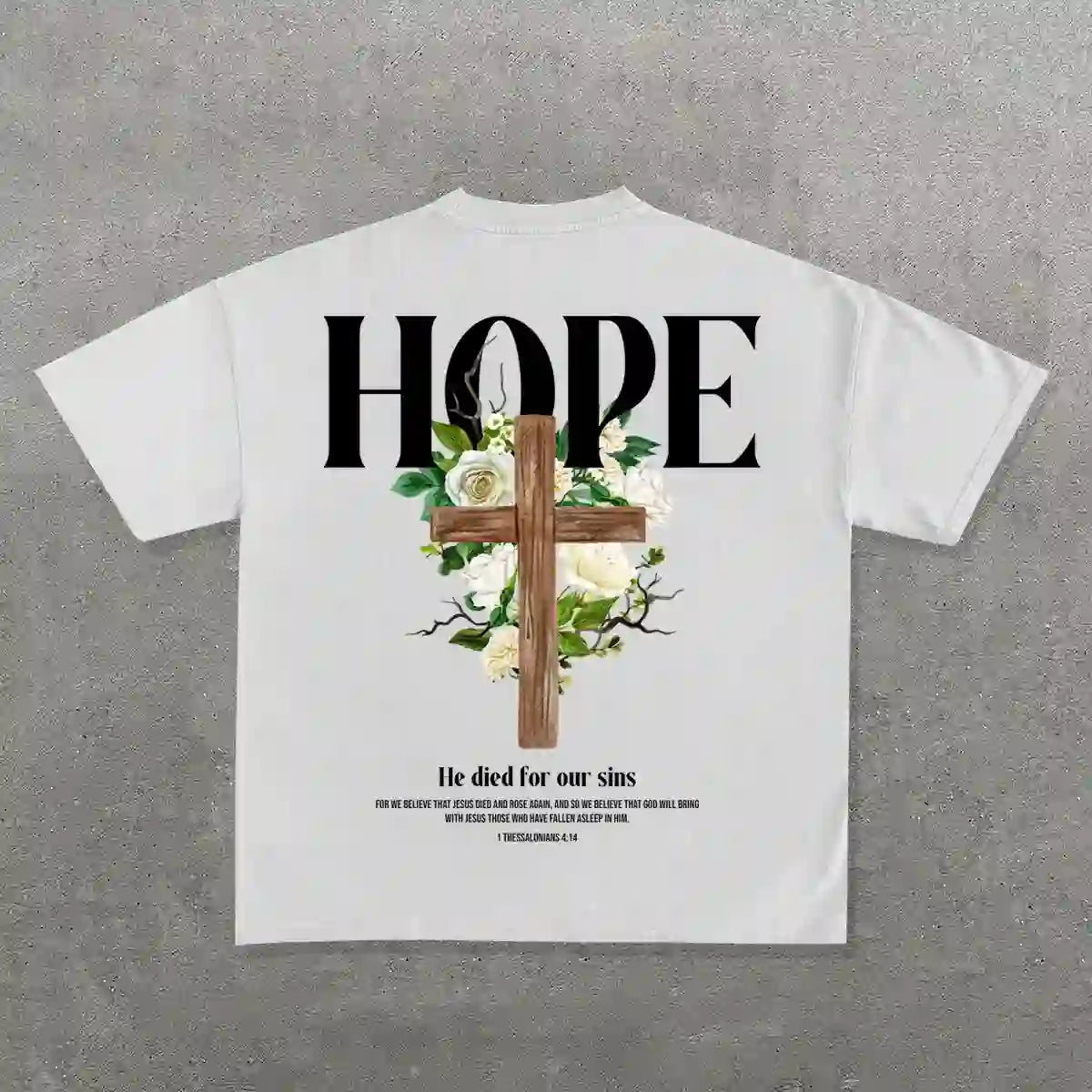 The back design of this T-shirt is very visually impactful. The oversized "HOPE" is eye-catching, symbolizing the light of hope brought by Jesus in the Christian faith. The wooden cross below is surrounded by flowers and green leaves. The cross is the core symbol of Christianity, representing Jesus' suffering and redemption; the flowers represent purity and beauty. The text at the bottom, "He died for our sins", points out the doctrine of Jesus' sacrifice to redeem the world, conveying a deep religious connotation.