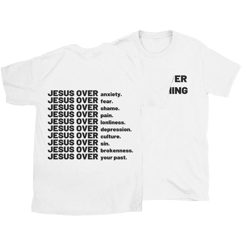 On the back of the T-shirt, "JESUS OVER" is paired with negative emotions such as anxiety, fear, and shame, as well as words from past difficulties, clearly conveying Jesus' firm belief that he can overcome all difficulties and negativity, giving spiritual comfort and strength.