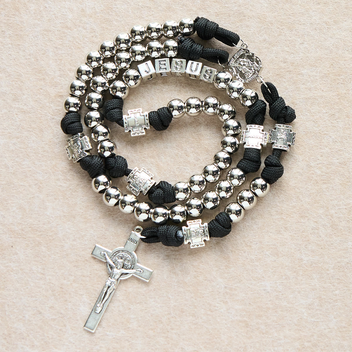 Its structure echoes Ephesians 6:11: “Put on the full armor of God, that you may be able to stand against the wiles of the devil.” The black cords symbolize humility and perseverance, the silver beads gleam as signs of holiness and divine protection. -