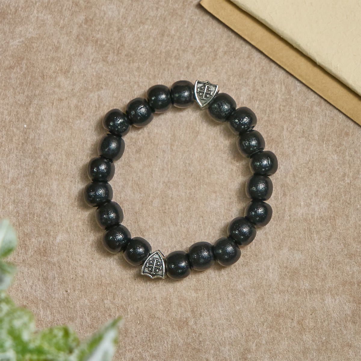 This handcrafted prayer bracelet combines smooth black wooden beads with dual silver Jerusalem Cross shields—each a symbol of protection and the believer’s mission to carry Christ’s light into every corner of the world. -