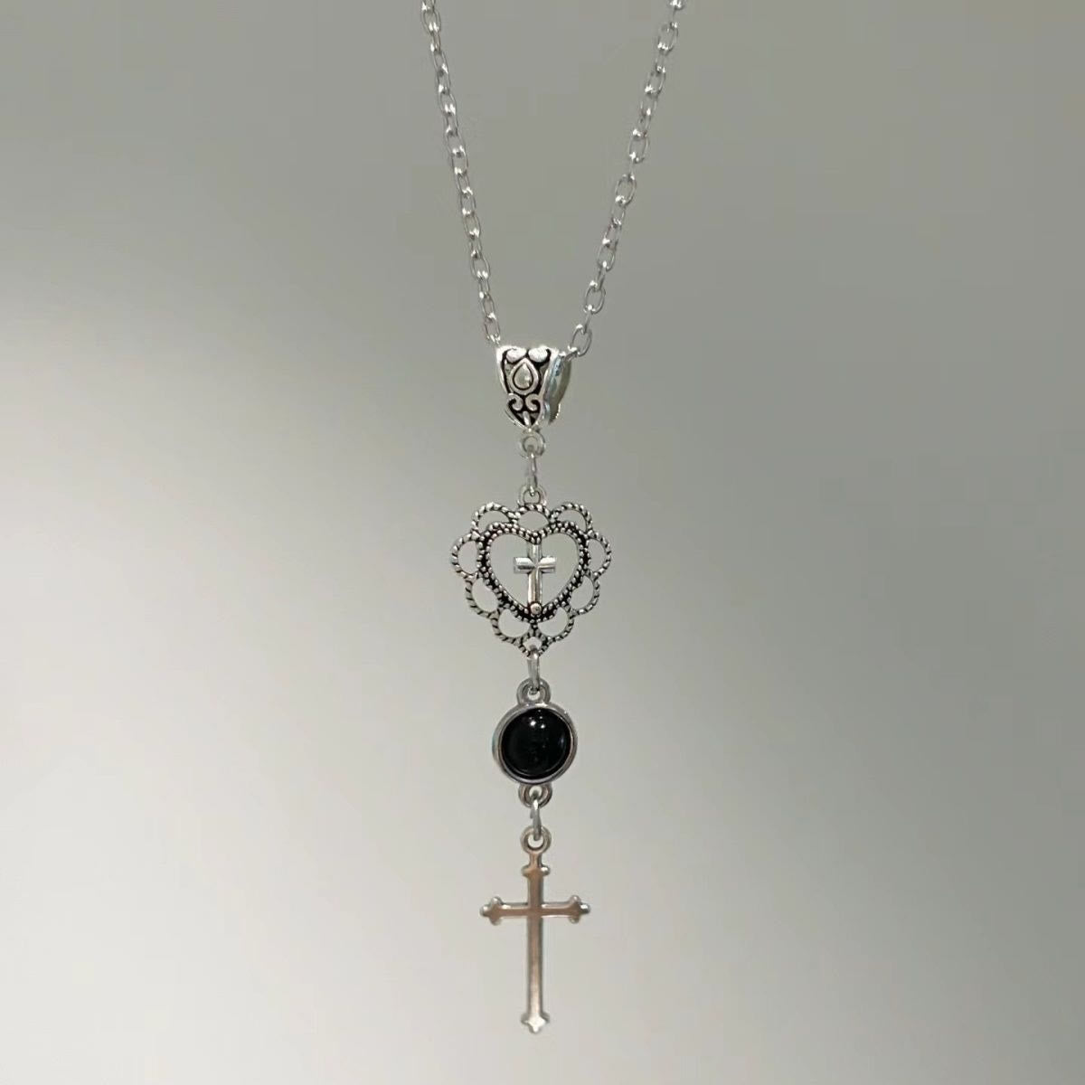 This layered necklace draws the eye from an ornate heart frame with an inner cross to a slender cruciform drop—an elegant “path from heart to Cross.” -