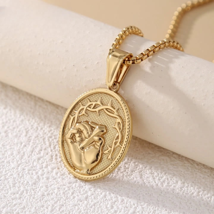 Classic Three-Tone Engraved Oval Pendant with Jesus Holy Hand & Thorn Crown