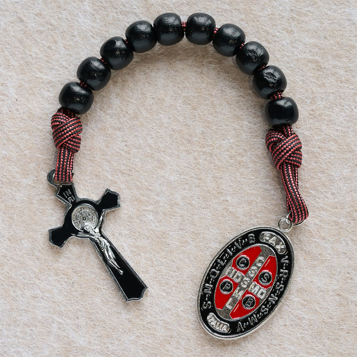 This single-decade paracord rosary unites black wooden beads, red-black cord, and dual St. Benedict emblems in a compact form—crafted for believers who carry faith as armor. Bold, portable, and purposeful, it embodies the prayer of warriors who trust in the Lord’s protection through every trial. -