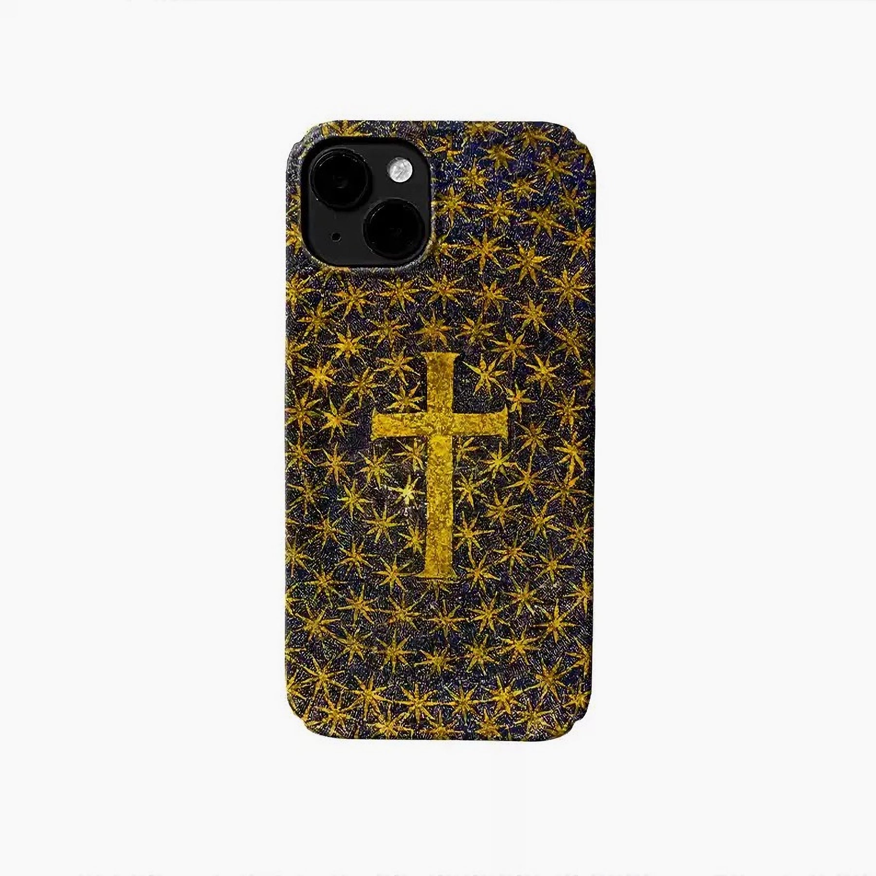 This phone case features a radiant golden cross set against a pattern of shimmering stars, bringing a touch of heavenly light to your everyday life. -