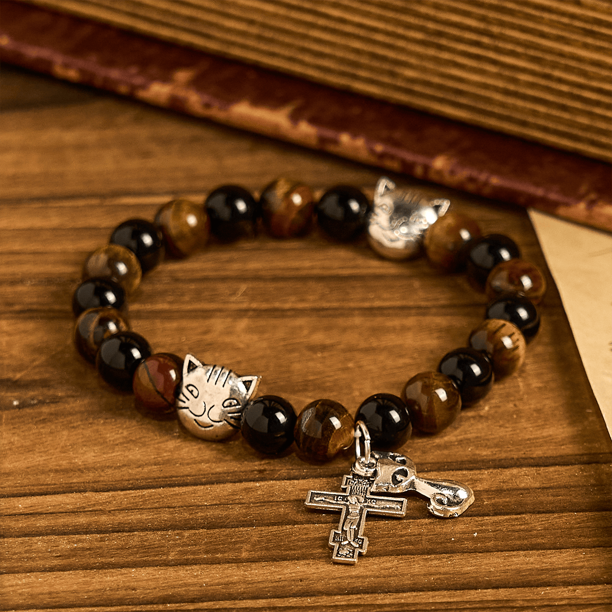 This animal bracelet strings warm brown–black beads with twin tabby-cat charms and a small crucifix—made to keep prayer for pets and strays close at hand. -