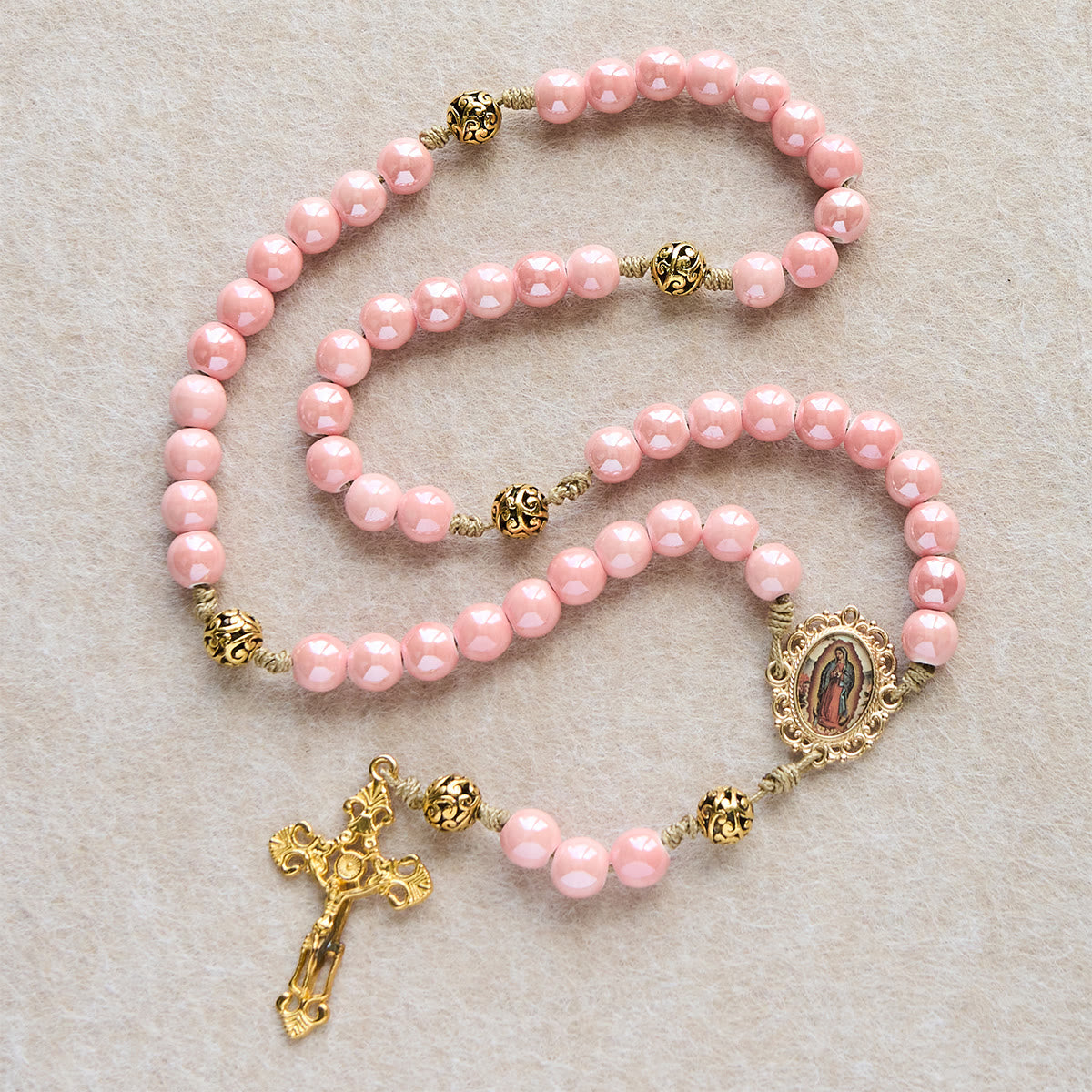 The gentle blush of the ceramic beads embodies Mary’s compassion and the joy of the Nativity. The Our Lady of Guadalupe centerpiece unites the faithful with her interceding love, while the gold crucifix proclaims Christ’s triumph—the promise of salvation fulfilled on that Holy Night. -