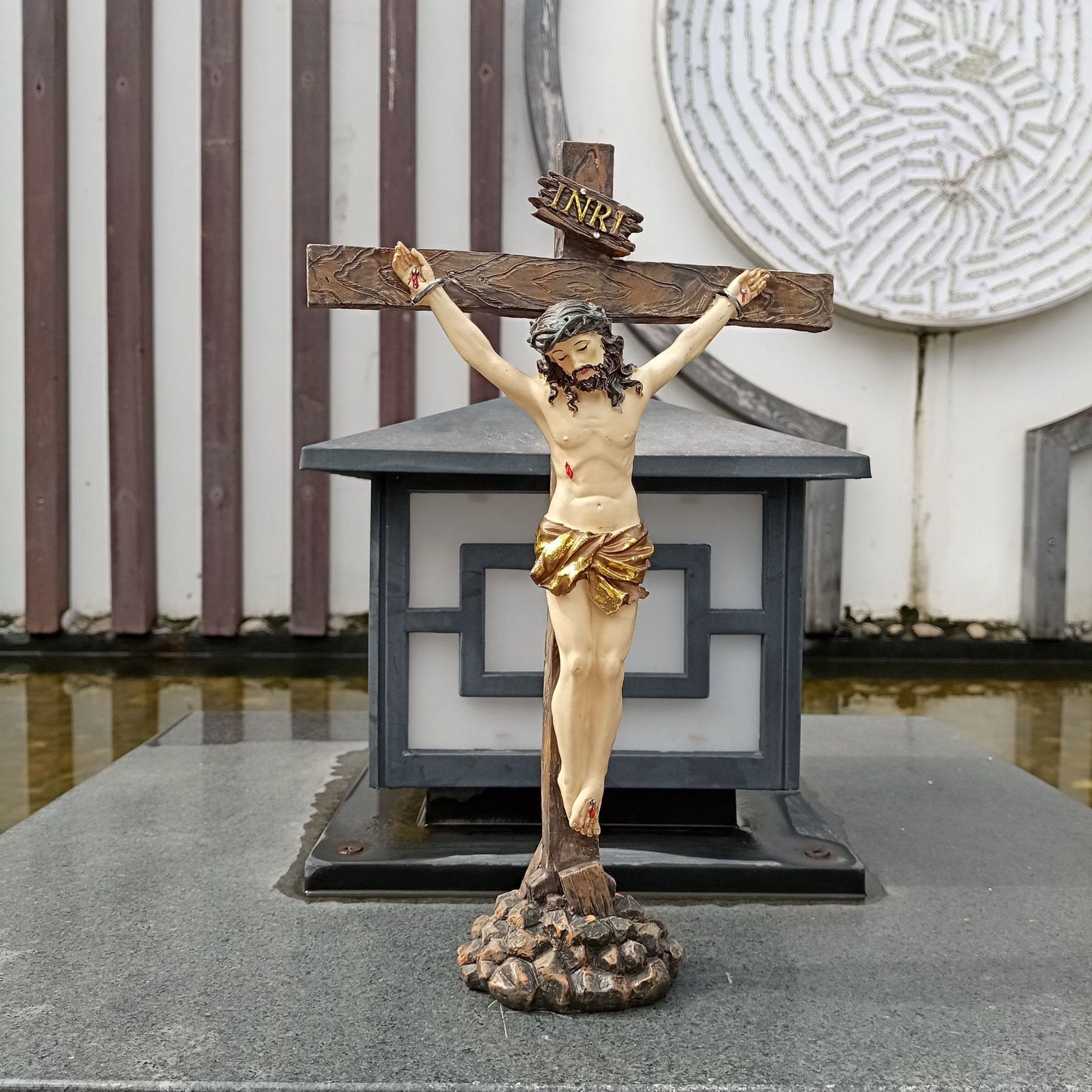 The crucifix, with Jesus nailed to it, is a fundamental symbol of the Christian faith. It stands as a testament to Jesus' role as the Savior, bridging the gap between humanity and the divine. The inscription "INRI" (Jesus of Nazareth, King of the Jews) atop the cross is a historically and biblically significant detail, further anchoring the piece in Christian tradition. -