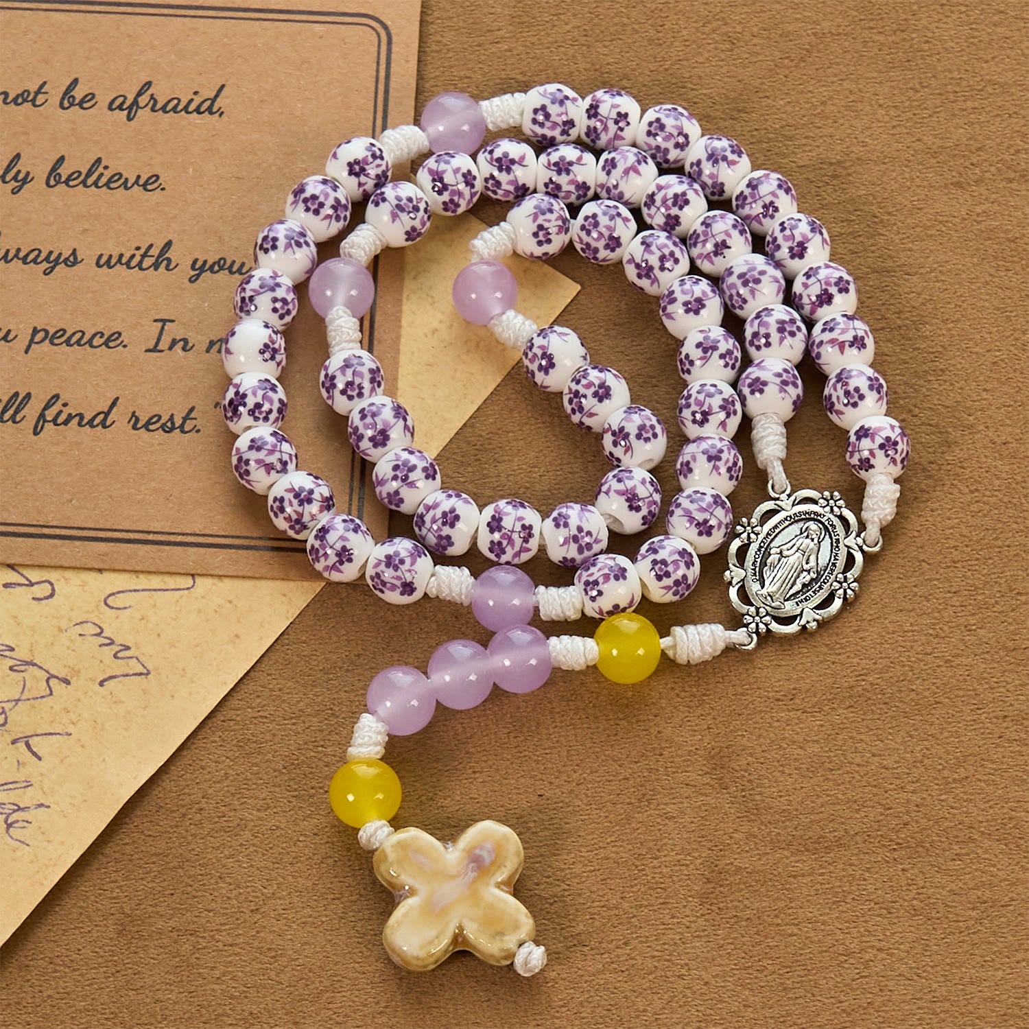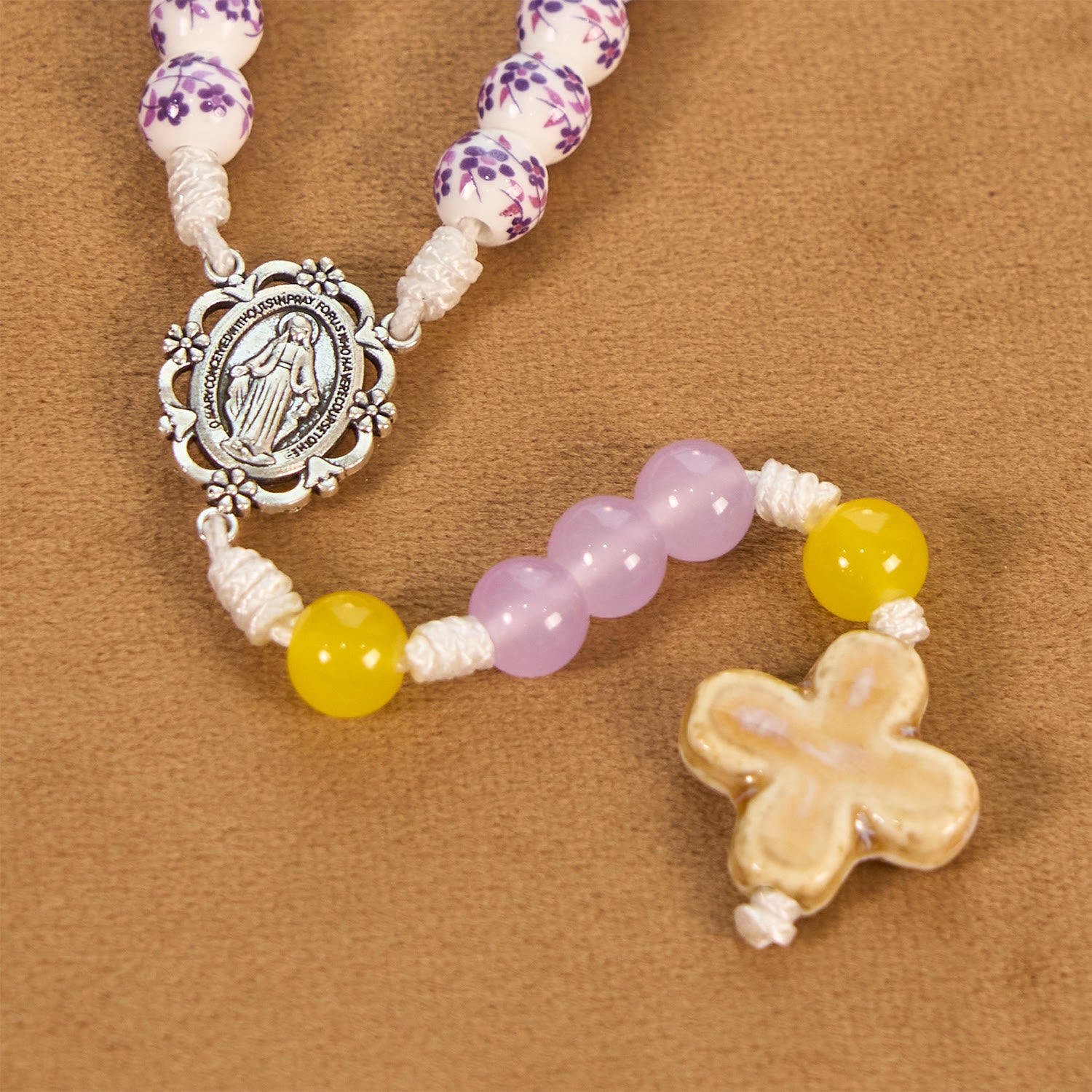 Miraculous Medal & Cross of 8mm Flower Ceramic Beads Handmade Rosary for Holy Prayer