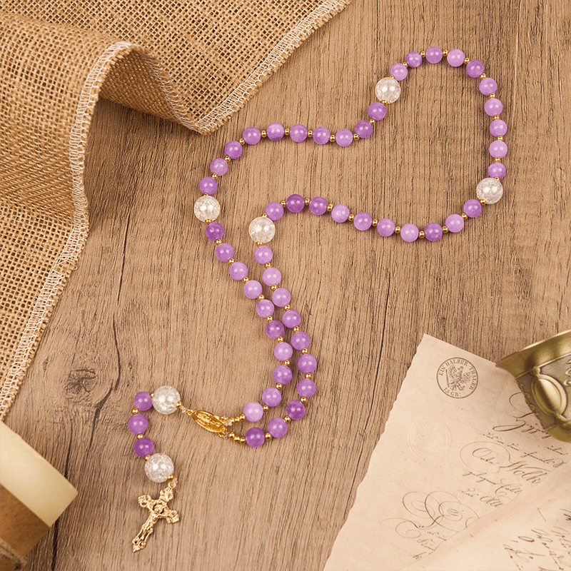 Complementing the amethyst are the clear crystal beads, symbolizing purity and clarity. These beads serve as a reminder of Christ's pure love and the unending grace of God. Each clear bead provides a moment of reflection, allowing you to feel closer to the Lord during your devotions. -