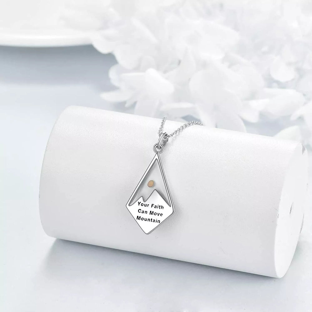 Elegant Design: This triangular pendant showcases an iridescent mountain design with a mustard seed encapsulated within, symbolizing faith and endless possibilities. The back of the pendant is inscribed with "Your Faith Can Move Mountain," reinforcing its inspiring message.