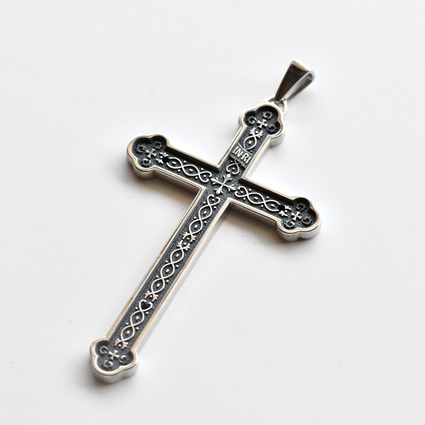 A retro sterling silver cross bears the INRI inscription—time-worn letters whispering Christ’s sovereign sacrifice. Forged as a tactile testament of enduring faith. -