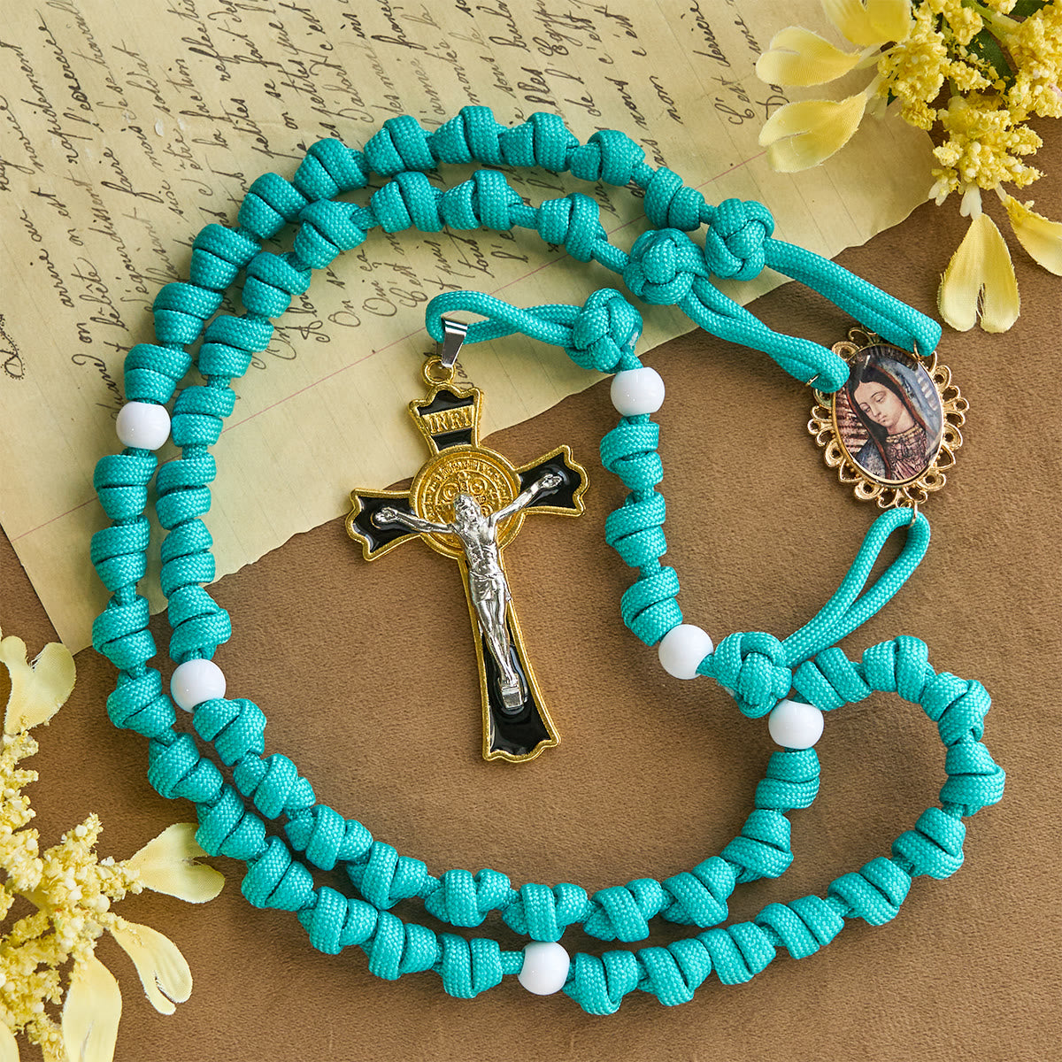 This vibrant turquoise rosary pairs tactile paracord knots with bright white spacers, a Guadalupe cameo, and a bold St. Benedict crucifix—steady in the hand, clear in devotion. -