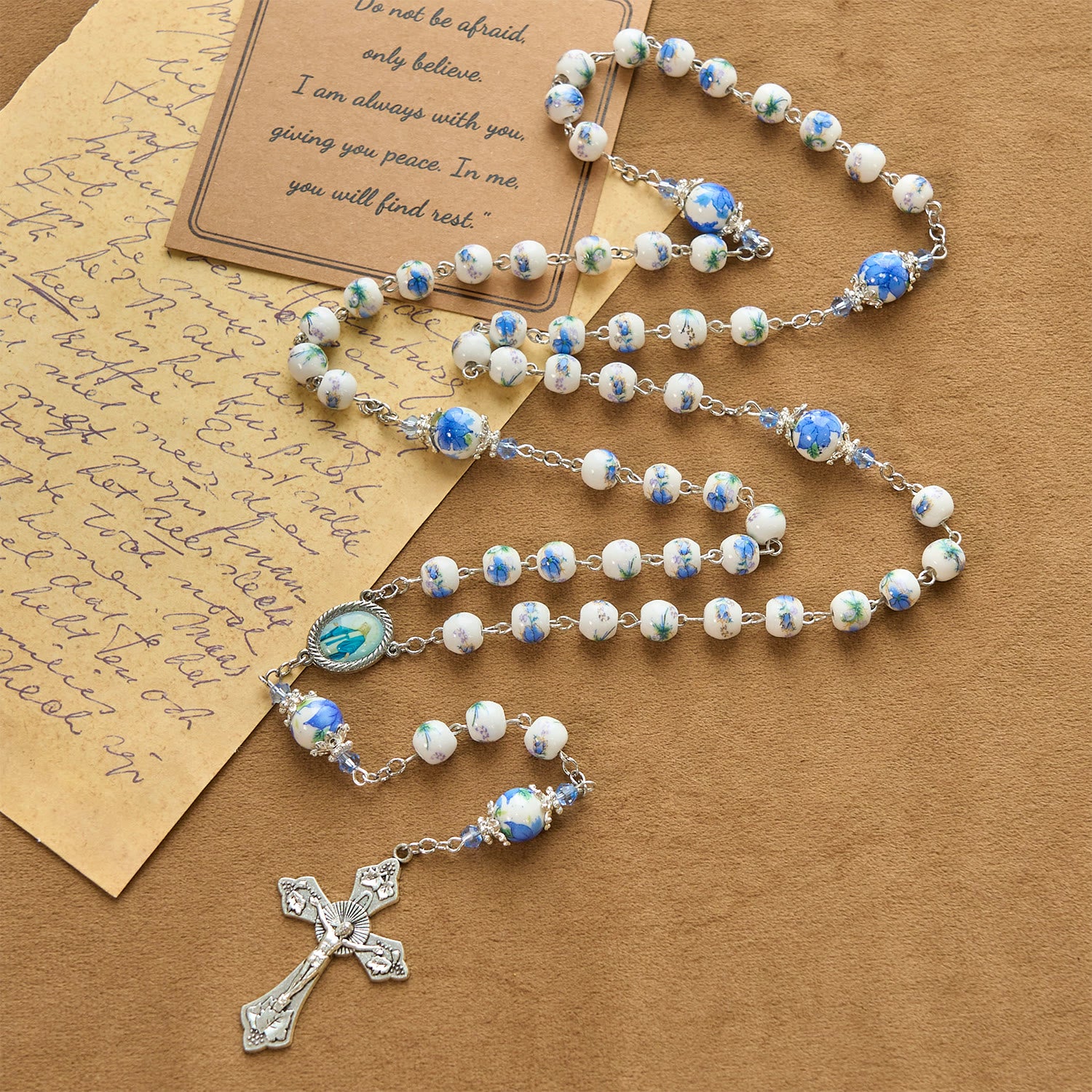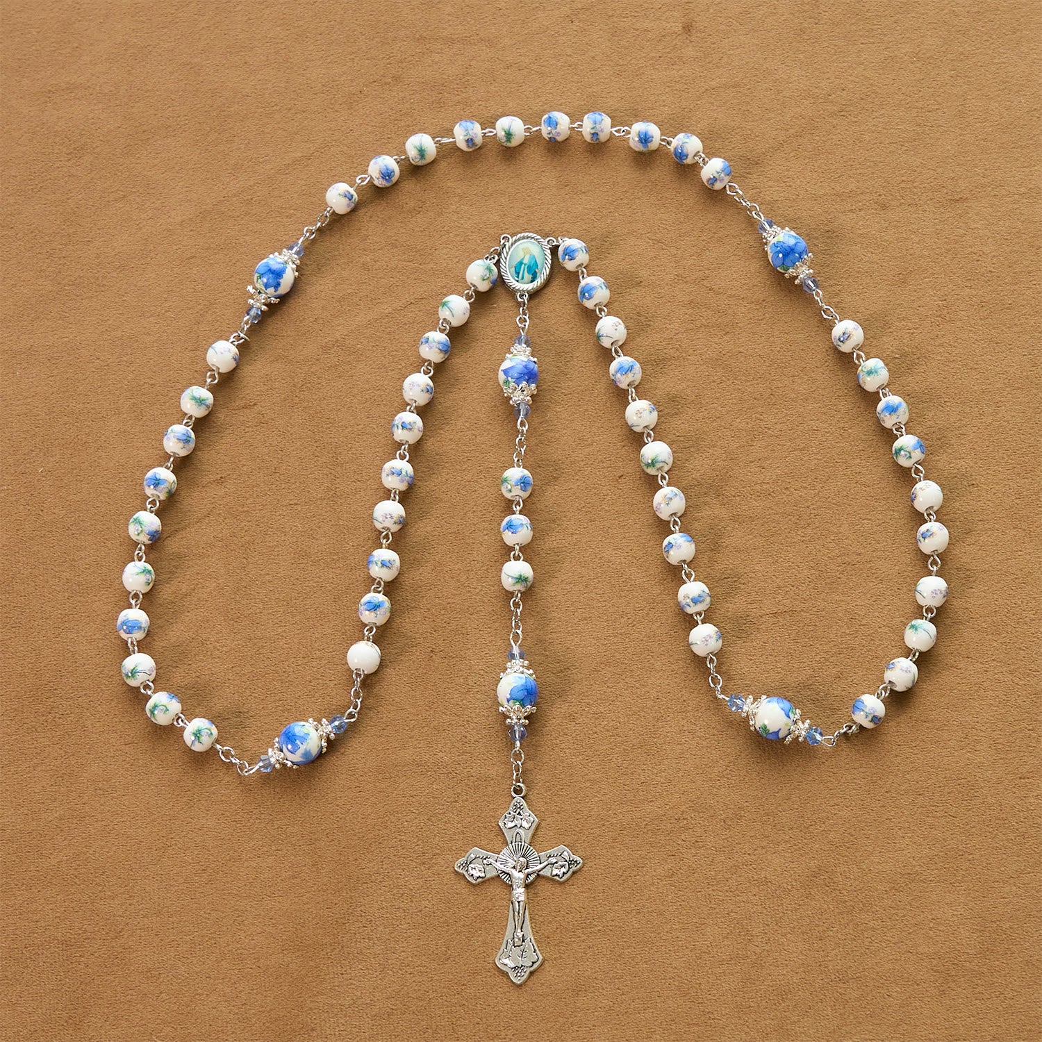 Hand - crafted with care, it pairs white beads with blue floral patterns and silver accents. The detailed crucifix and medal enhance its beauty. -