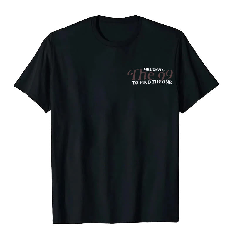 The back of this T-shirt is designed with ingenuity, with the words "HE LEAVES The 99 TO FIND THE one" eye-catching, and the black and white pattern of a person standing on the top of the mountain, vividly reproducing the classic scene of the shepherd looking for sheep in Matthew 18:12, and deeply interpreting God's persistent salvation and endless care for every individual.
