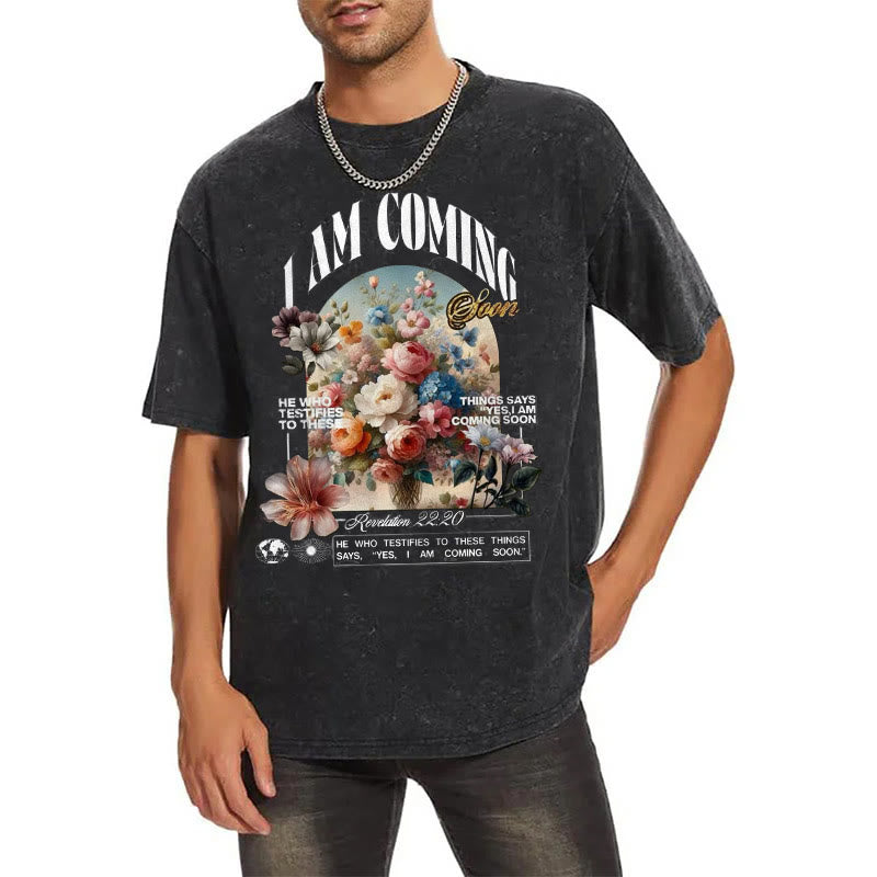 - This T-shirt features the powerful phrase "I AM COMING" prominently displayed. The design is inspired by Revelation 22:20 in the Bible, where it states, "He who testifies to these things says, 'Yes, I am coming soon.'" This verse refers to the promised second coming of Jesus Christ, a central eschatological belief in Christianity.