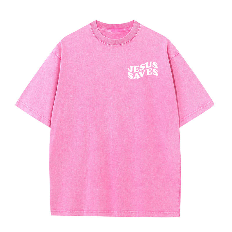 On the back of this T-shirt, a striking design is displayed. It features repeated "JESUS" and "SAVES" lettering, along with a cross, conveying the message "Jesus Saves". Wearing it is not only a way to show a powerful faith statement but also a reminder for us to hold onto the belief in Jesus' saving grace, keeping this inspiring message in our thoughts in our daily lives.