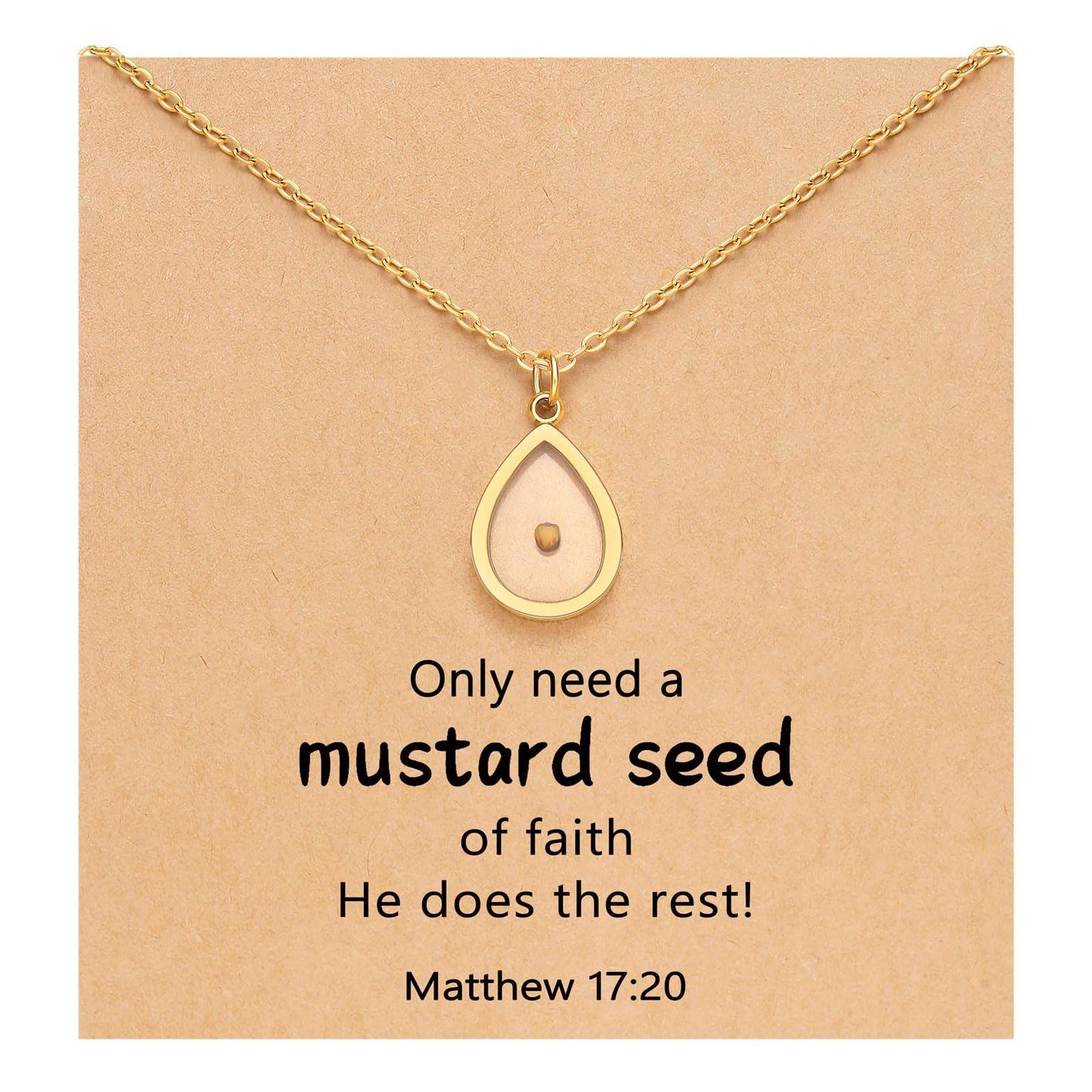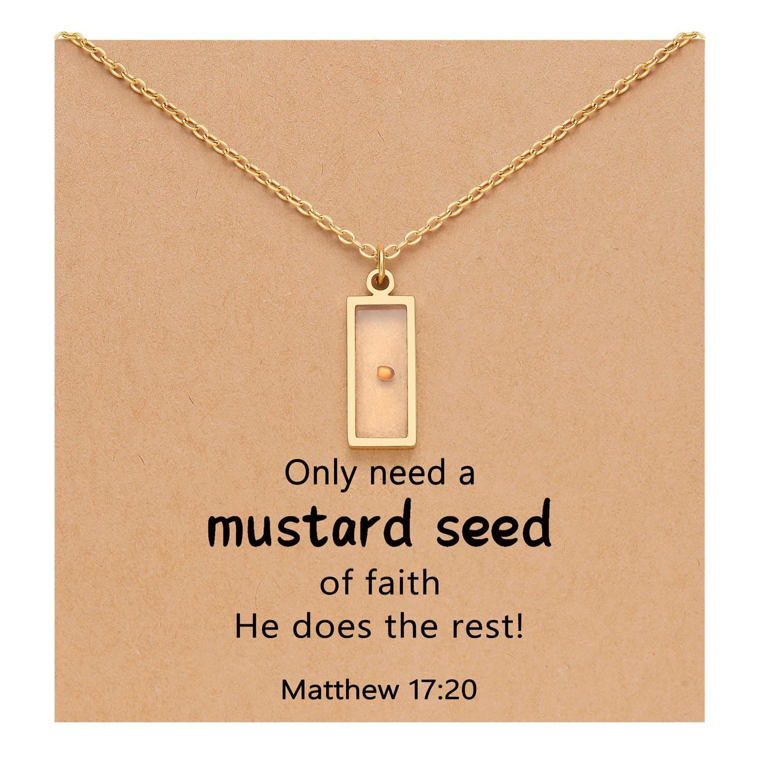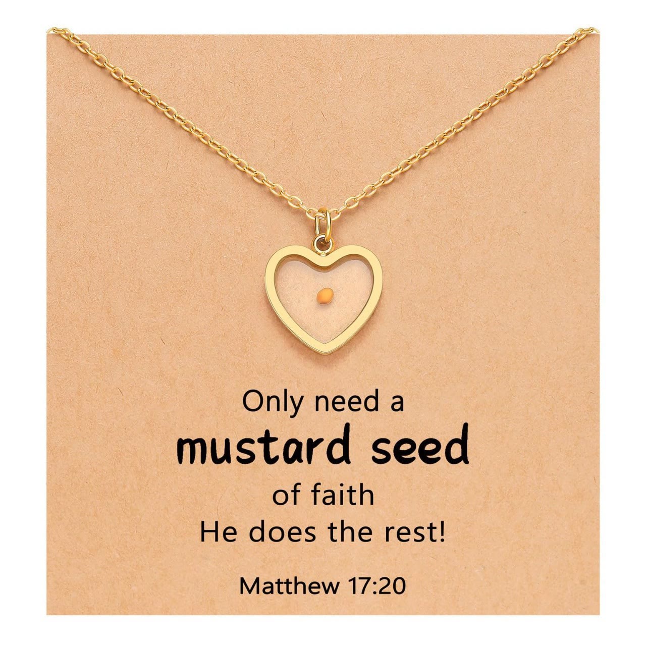 This necklace merges the "mustard seed faith" motif (Matthew 17:20) with heart-shaped (and other shaped) enclosures — pairing spiritual warmth with delicate design to create a soothing companion for daily moments. -