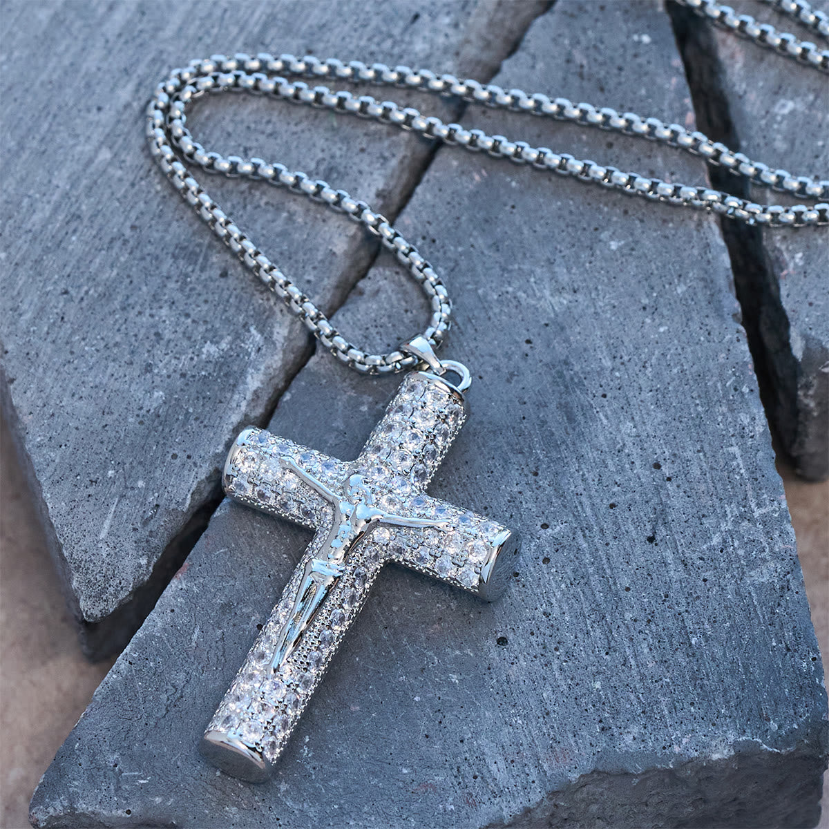 Cast in glowing metal, the cross is lined with shimmering stones, featuring intricate engravings of the crucified Jesus. Meticulously crafted, it honors your faith journey, blending sacred meaning and modern luxury.