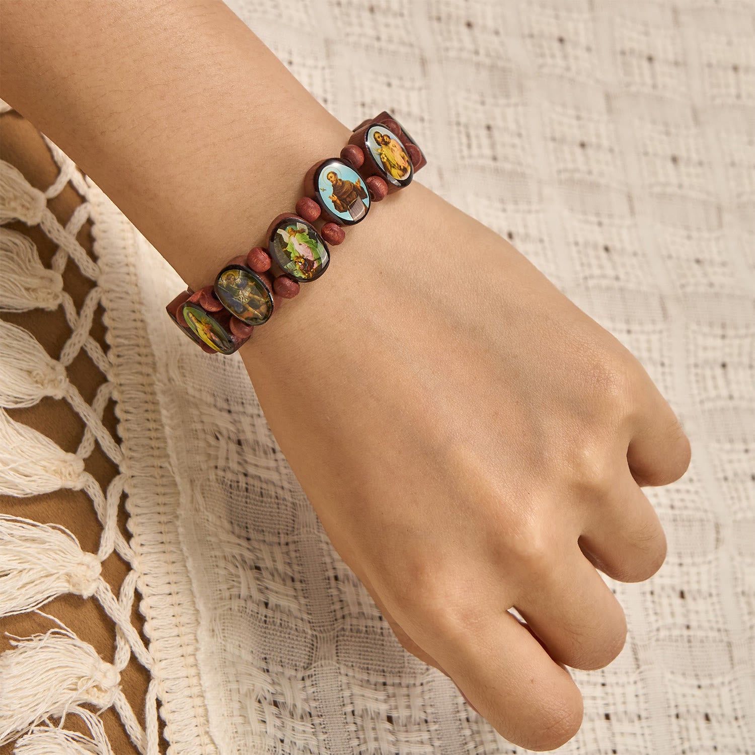 Classic Wooden Bead Stretch Bracelet with Mary, Jesus & Saints Icons