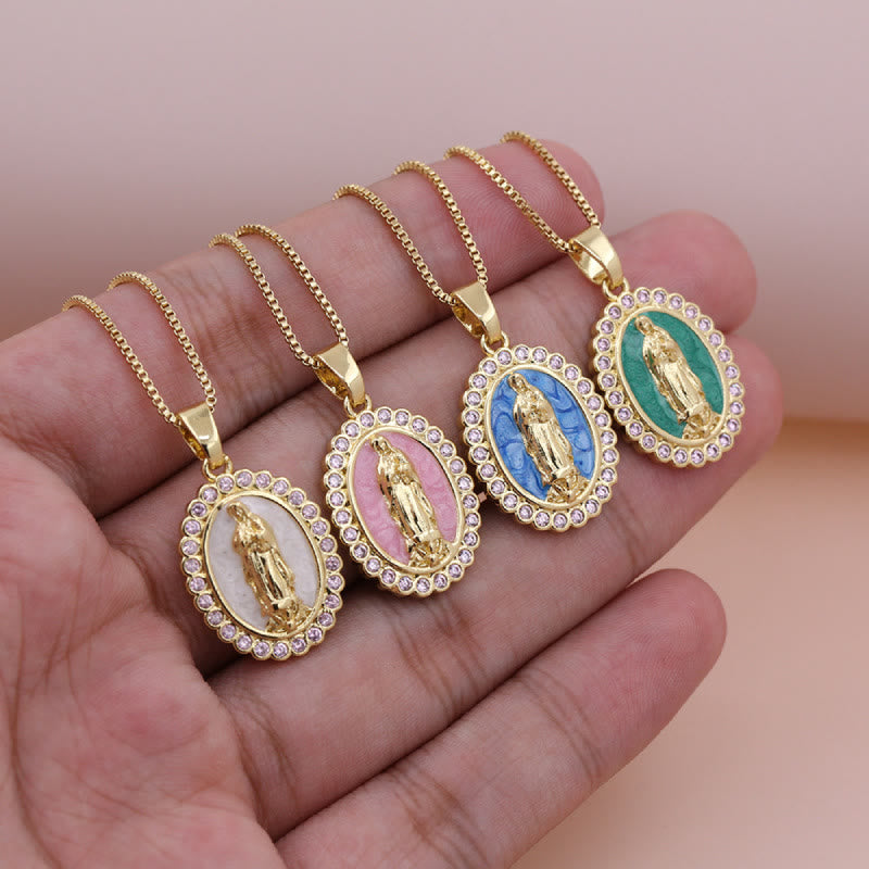 This Our Lady pendant necklace (offered in multiple tones, encrusted with shimmering stones) merges her sacred likeness with luminous, colorful design — pairing gentle style with the quiet comfort of her intercession to craft a wearable reminder of grace. -