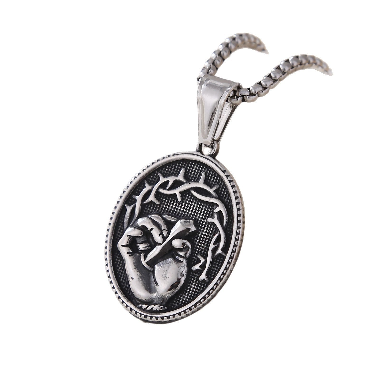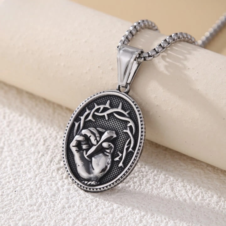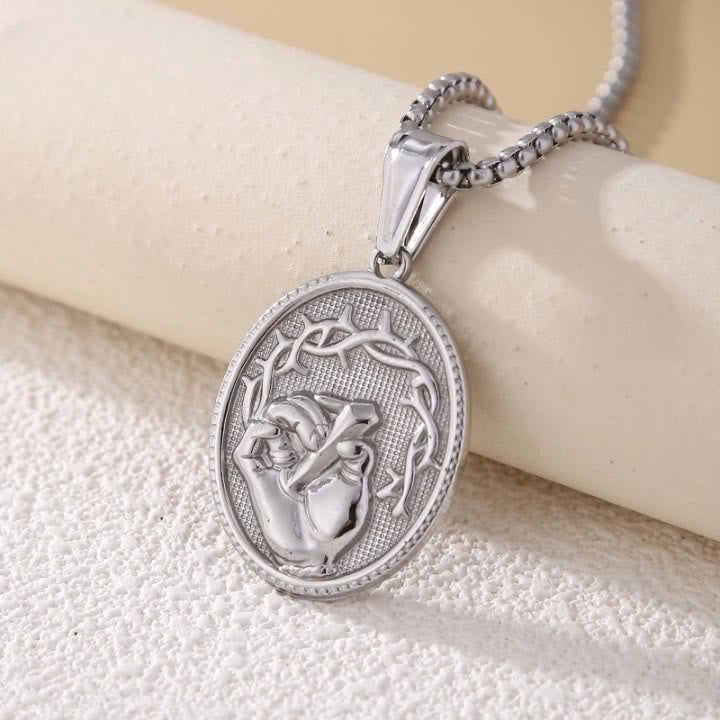 Classic Three-Tone Engraved Oval Pendant with Jesus Holy Hand & Thorn Crown
