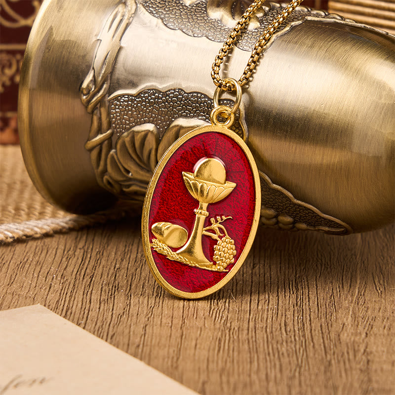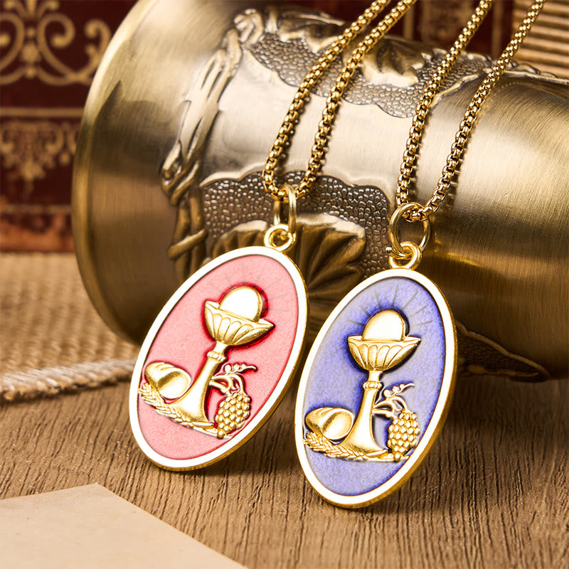 The necklace boasts a stunning pendant depicting the Eucharistic chalice, host, wheat, and grapevine—symbols of Christ’s body and blood. These elements are intricately detailed in gold-tone against a vibrant red or blue enamel background, creating a striking contrast that emphasizes its sacred significance.