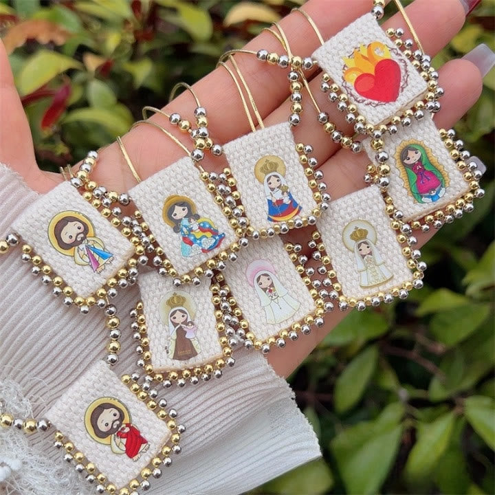 Each necklace showcases a distinct cartoon religious figure, from gentle depictions of revered saints to endearing portrayals of sacred symbols. -