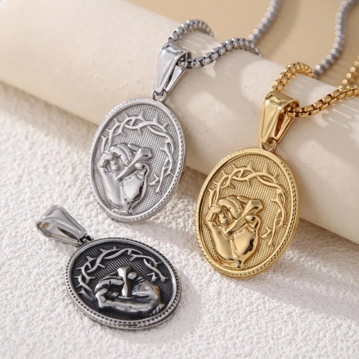 Christianartworkshop Classic Three-Tone Engraved Oval Pendant with Jesus Holy Hand & Thorn Crown