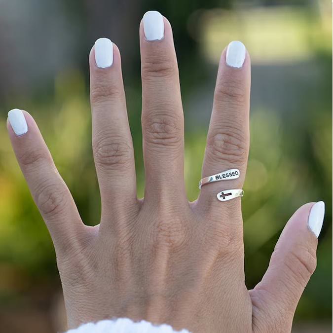 Crafted with polished silver - toned metal and featuring the word “BLESSED” alongside a delicate cross, this ring embodies a message of spiritual grace. The cross serves as an enduring symbol of faith and divine favor. -