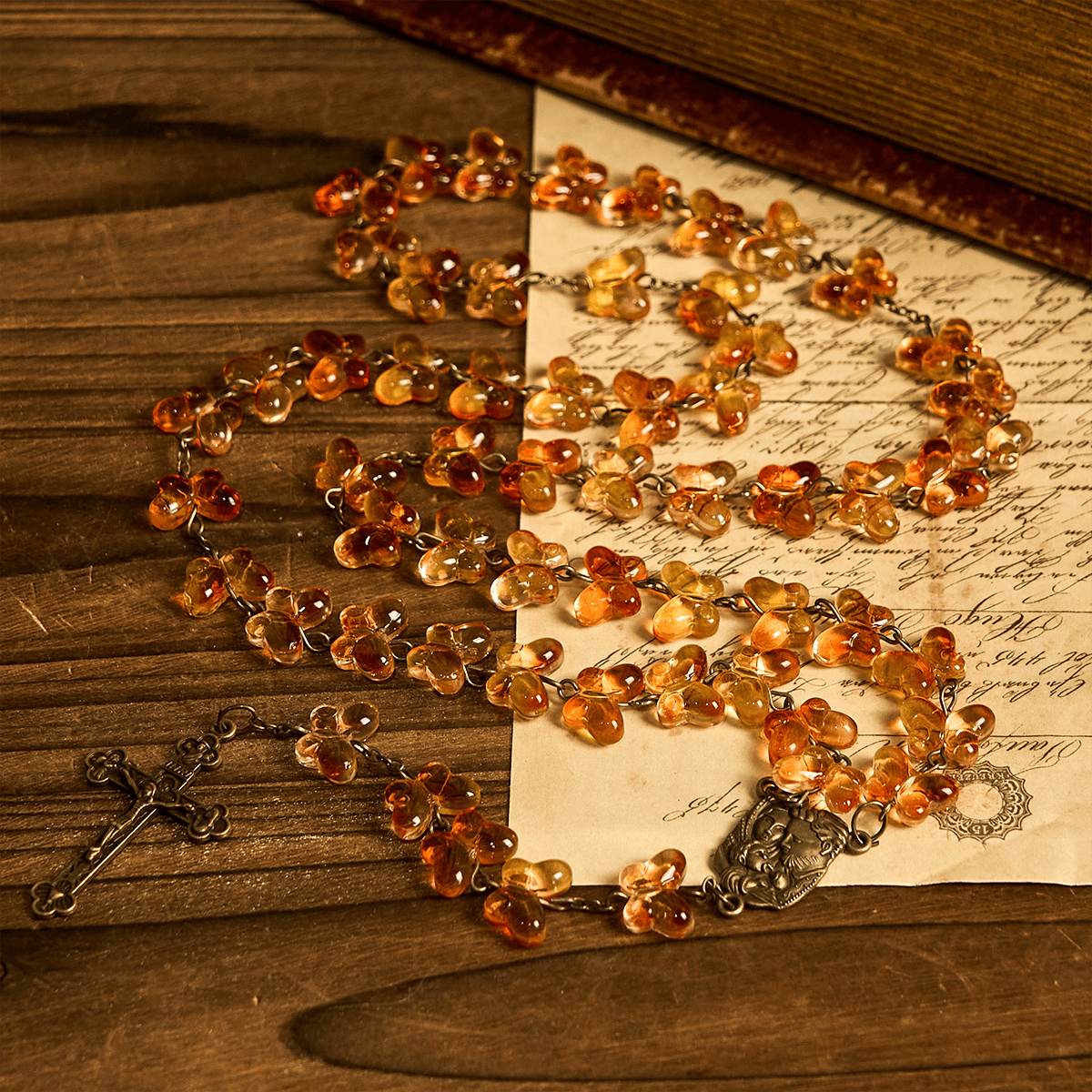 This rosary merges retro aesthetics with profound spiritual significance. The antique bronze crucifix and holy family medal evokes the timelessness of faith and Christ’s enduring love, while the autumn - hued, butterfly - shaped beads celebrate nature’s beauty and vintage allure, making prayer a heartfelt blend of devotion and nostalgic charm. -