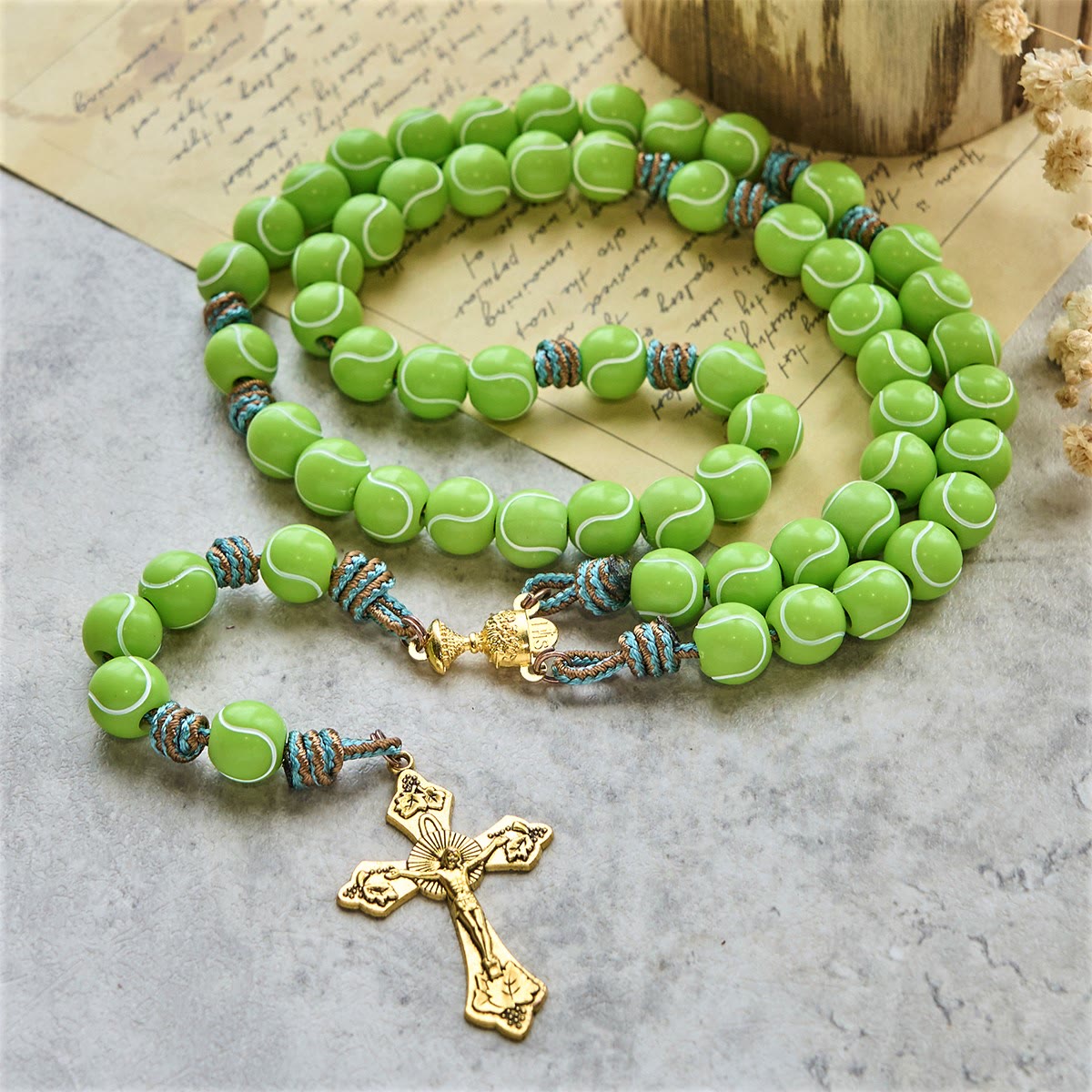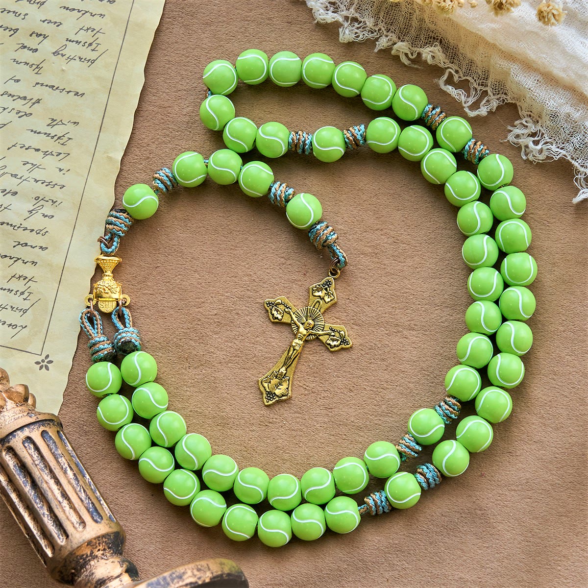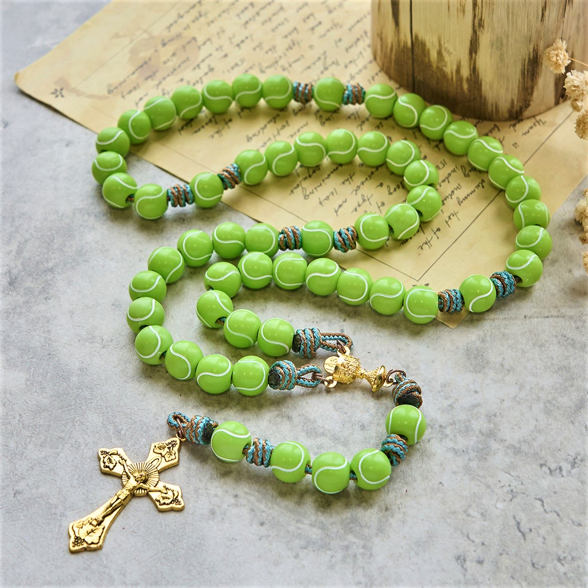 Vibrant green beads shaped like tennis balls create a lively, athletic theme. Paired with golden sacred elements, the design balances playful energy with solemn faith symbolism. -