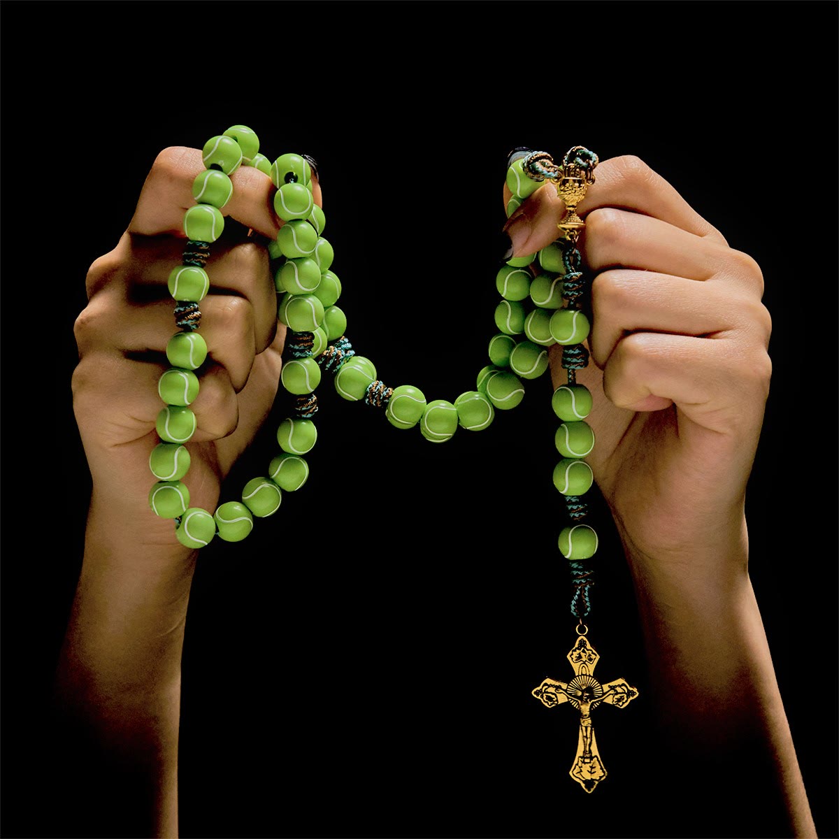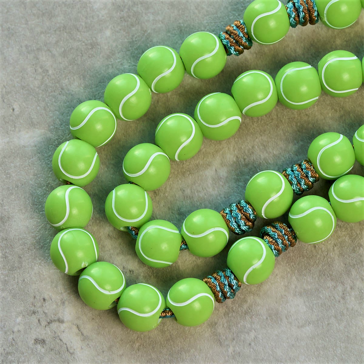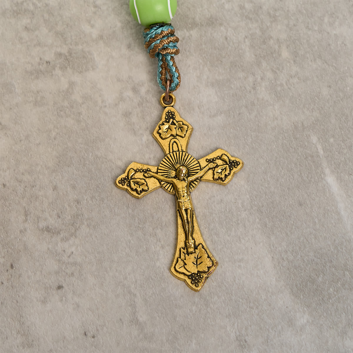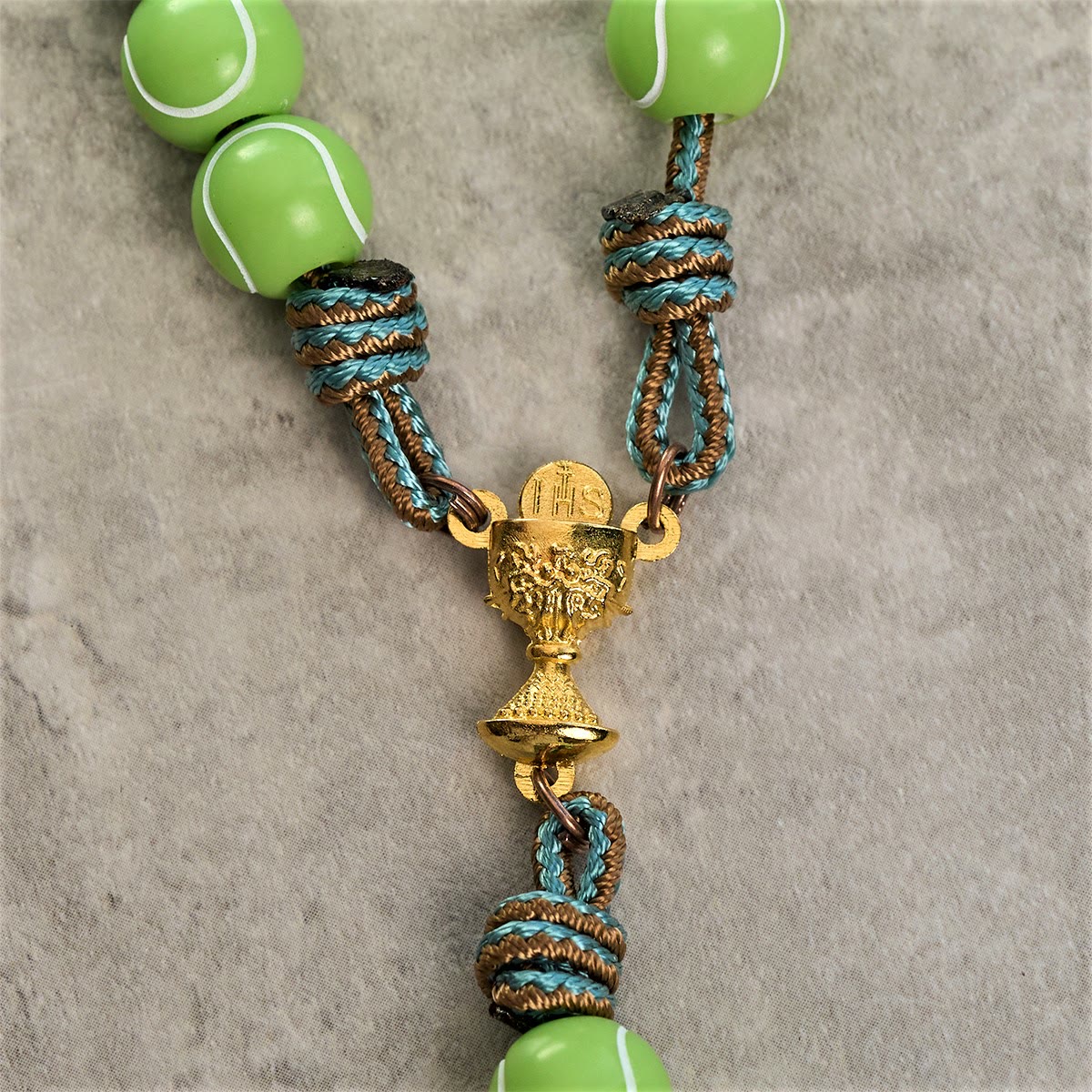 Vibrant green beads shaped like tennis balls create a lively, athletic theme. Paired with golden sacred elements, the design balances playful energy with solemn faith symbolism. -