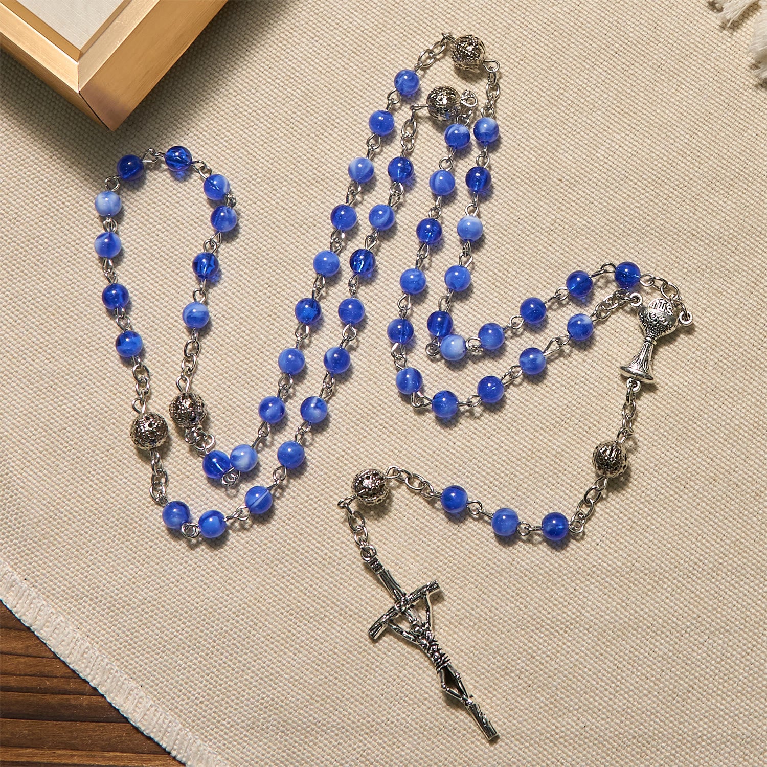 Gradient blue beads shift like tranquil waters, strung beside the Holy Grail and crucifix—a serene union of sacred symbolism and quiet devotion. -