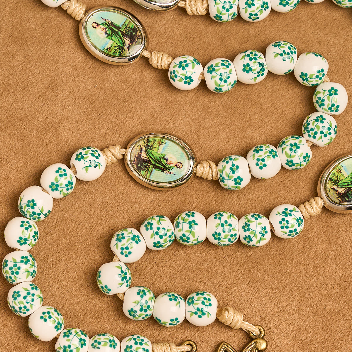 Adorned with delicate white beads accented by green floral patterns, this rosary radiates a sense of life, healing, and spiritual rebirth. Each prayer bead reflects the beauty of creation and the renewal found in Christ’s love. -