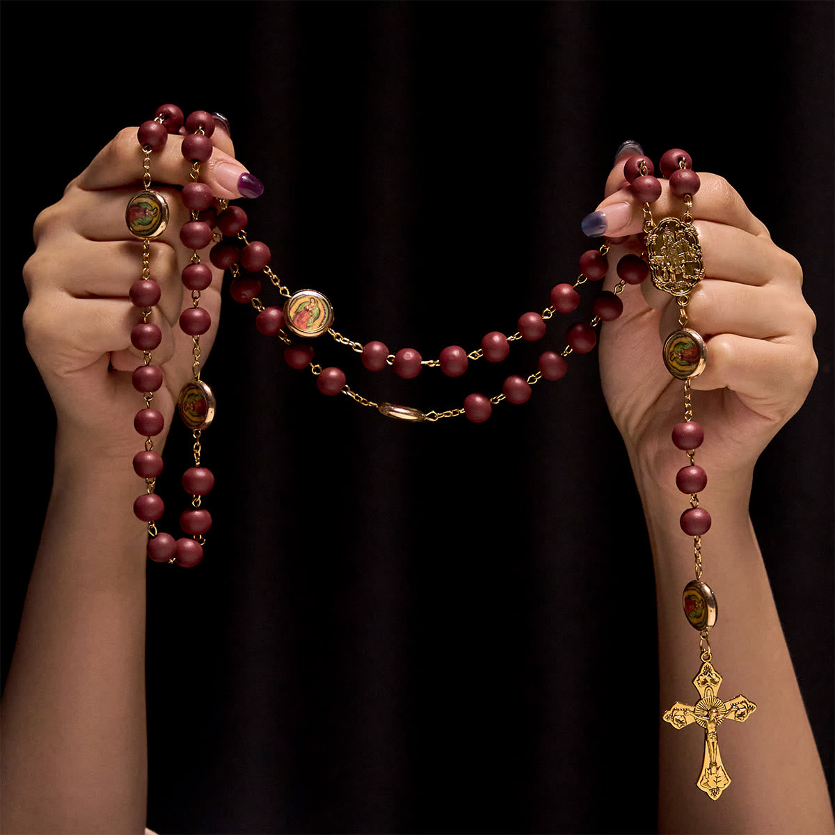 The rosary features unique Guadalupe image bead connectors, each a radiant reminder of the Virgin’s maternal care and intercession. -