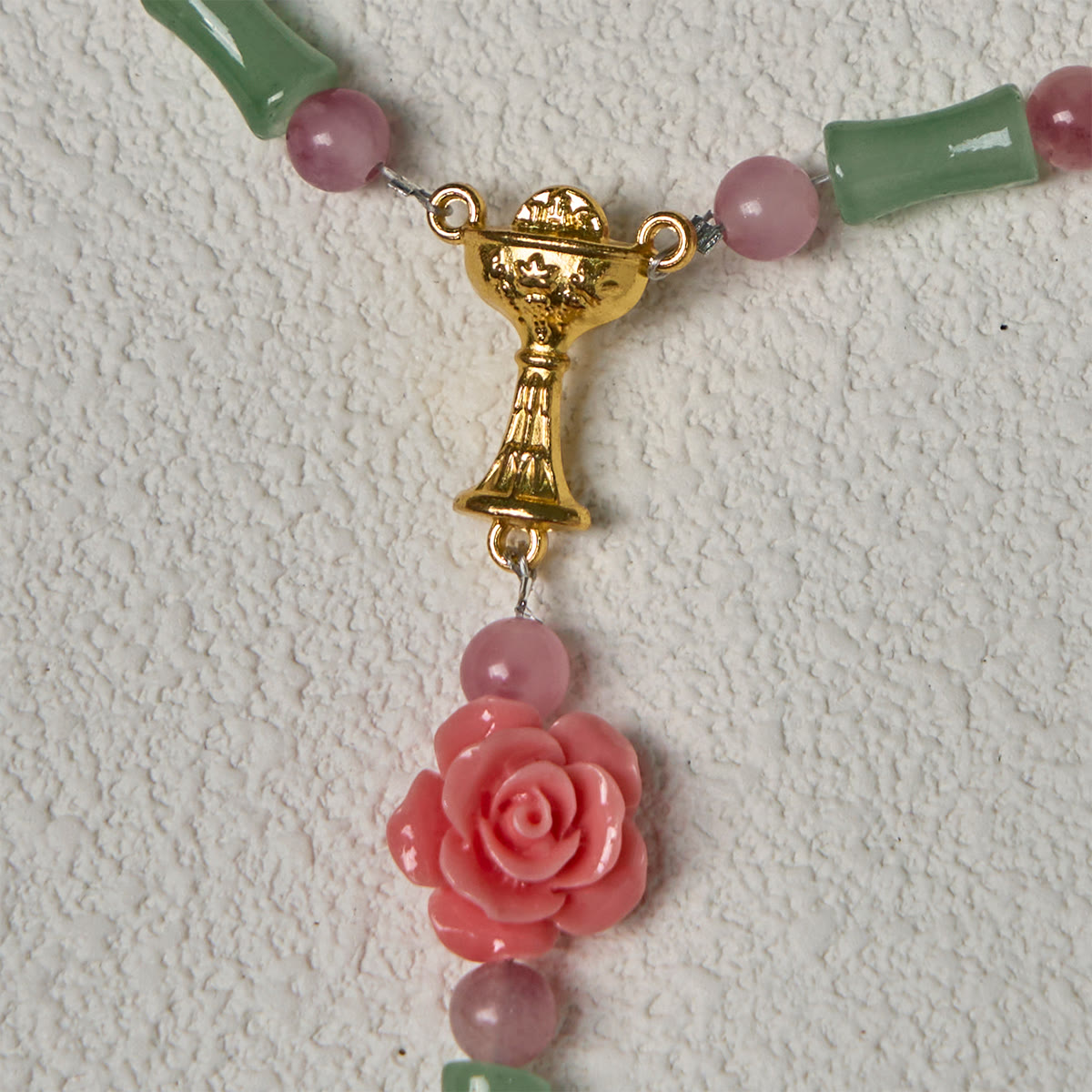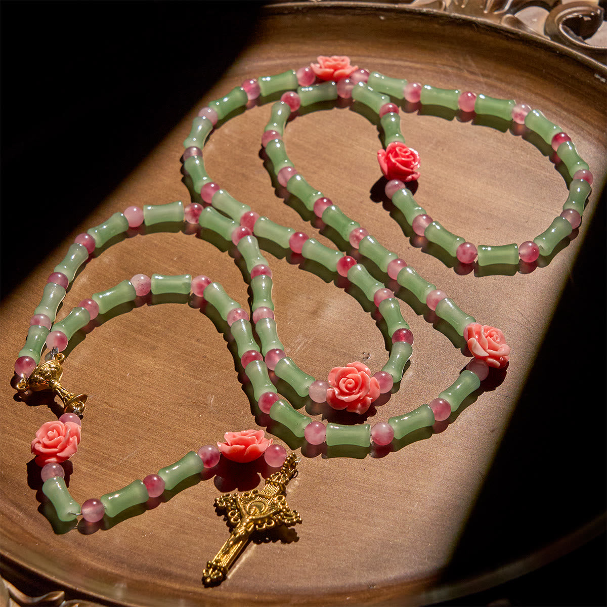 Gentle green bamboo-like beads and soft pink floral accents create a rosary that feels like a walk through a peaceful garden. -
