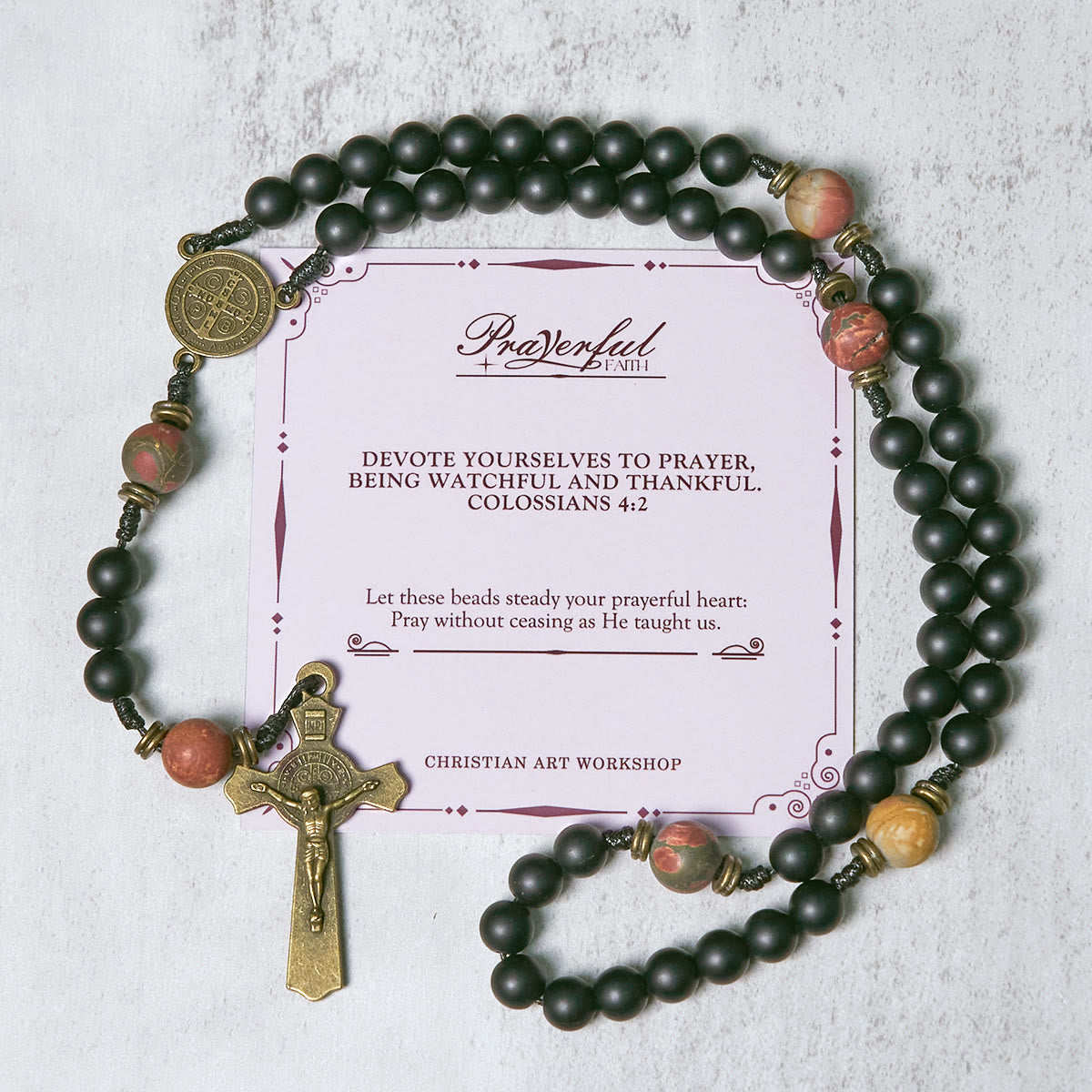 Handcrafted Matte Black and Earth-Tone Rosary Featuring St. Benedict
