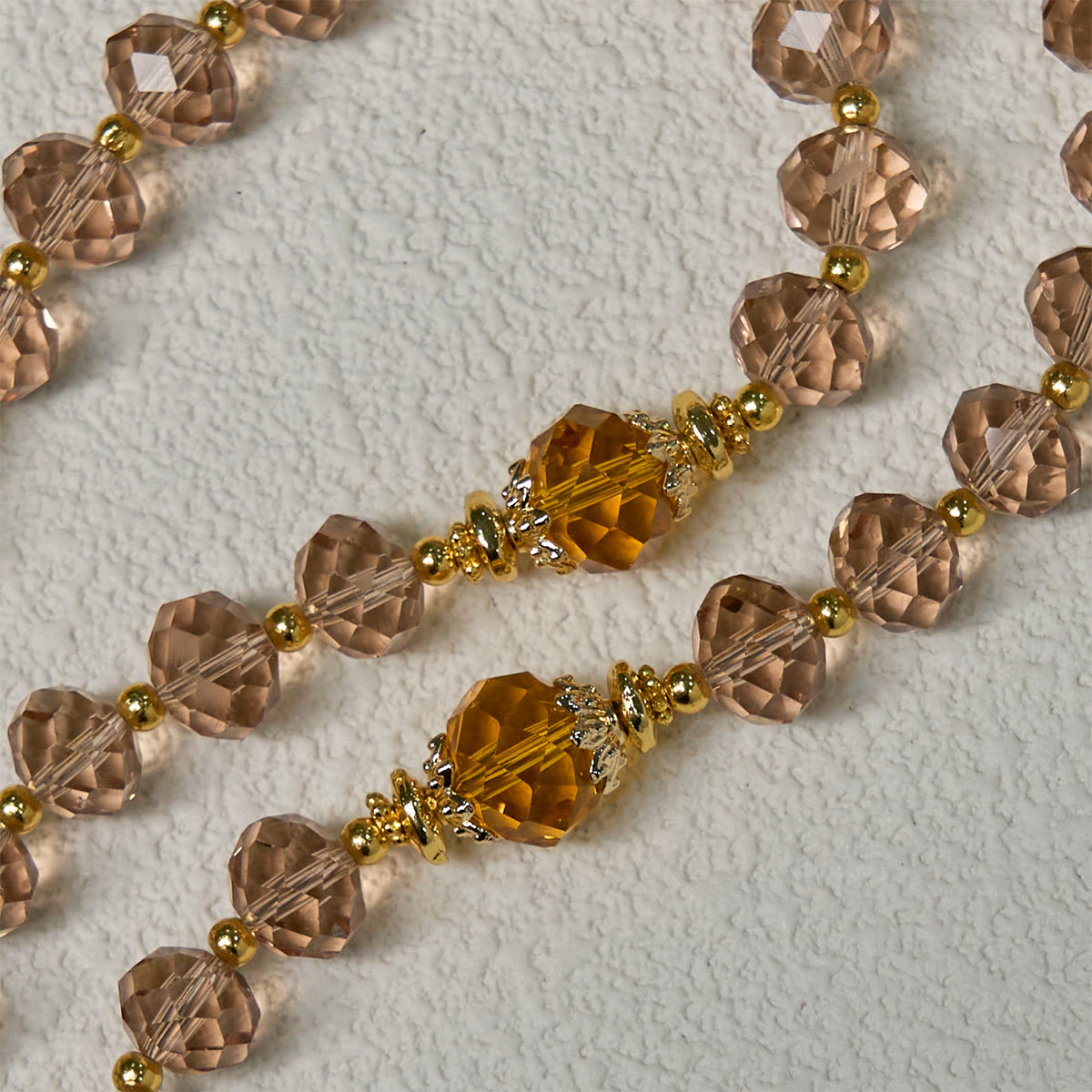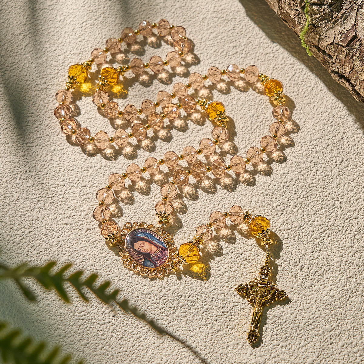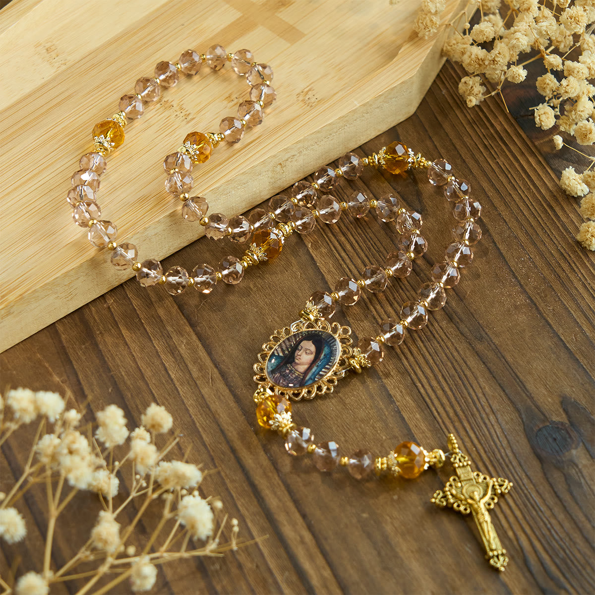 This radiant rosary features shimmering amber-toned beads that catch the light with every prayer, leading to the graceful centerpiece of Our Lady of Guadalupe. -